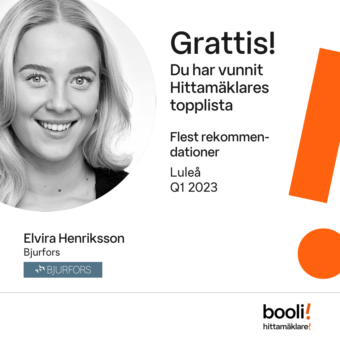 Statistik för publicerade bostäder, försäljningar och omdömen baseras på data från Booli och Hittamäklare. Statistiken för försäljningar avser inrapporterade och verifierade slutpriser från mäklare eller av Booli inhämtade och verifierade slutpriser. Statistiken för publicerade bostäder baseras på information som publicerats på Booli.se. Statistik för omdömen och rekommendationer baseras på omdömen från säljare som lämnats via Booli och Hittamäklare.