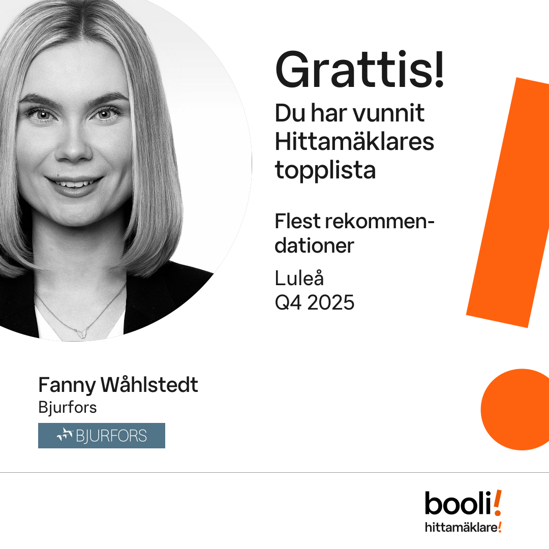 Statistik för publicerade bostäder, försäljningar och omdömen baseras på data från Booli och Hittamäklare. Statistiken för försäljningar avser inrapporterade och verifierade slutpriser från mäklare eller av Booli inhämtade och verifierade slutpriser. Statistiken för publicerade bostäder baseras på information som publicerats på Booli.se. Statistik för omdömen och rekommendationer baseras på omdömen från säljare som lämnats via Booli och Hittamäklare.