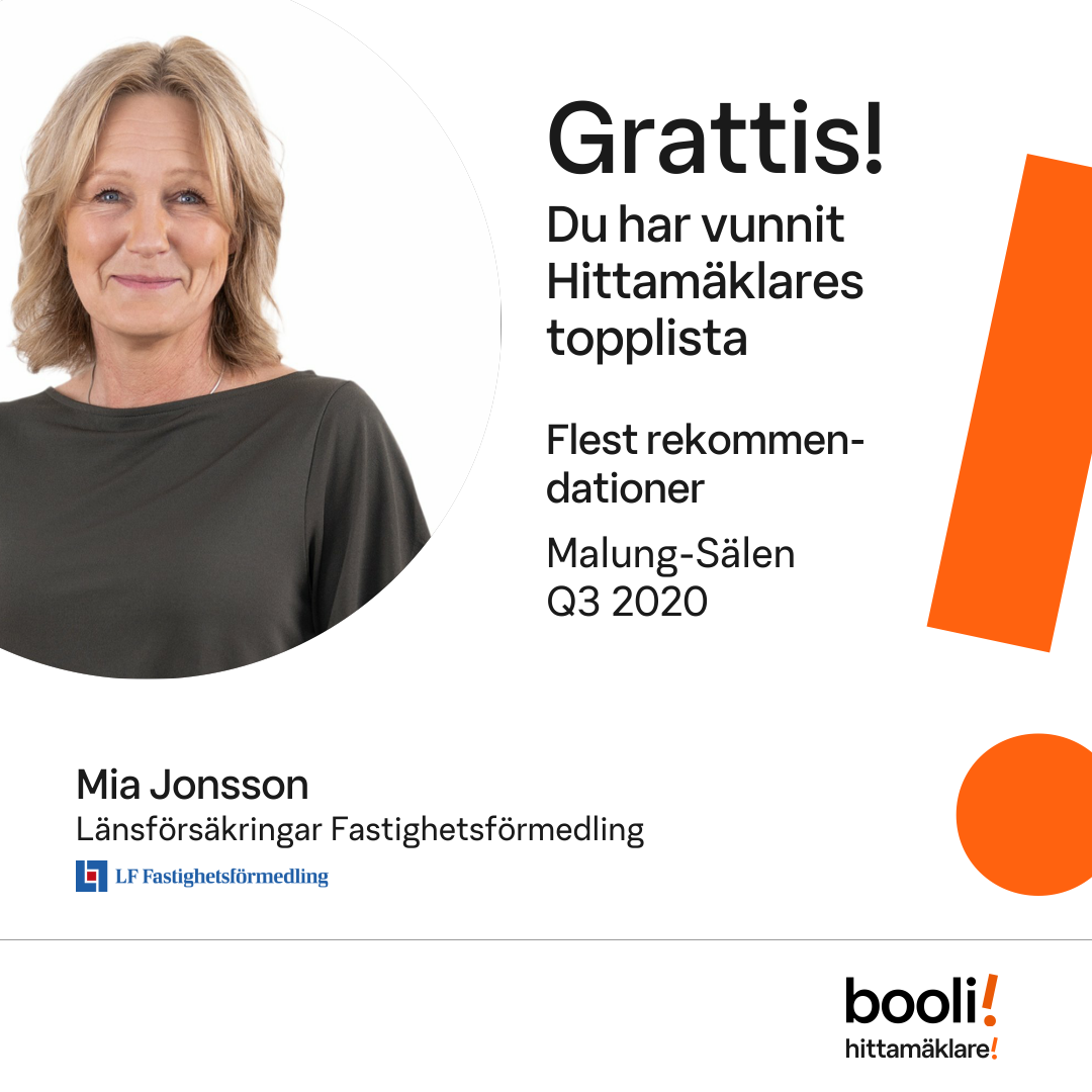 Statistik för publicerade bostäder, försäljningar och omdömen baseras på data från Booli och Hittamäklare. Statistiken för försäljningar avser inrapporterade och verifierade slutpriser från mäklare eller av Booli inhämtade och verifierade slutpriser. Statistiken för publicerade bostäder baseras på information som publicerats på Booli.se. Statistik för omdömen och rekommendationer baseras på omdömen från säljare som lämnats via Booli och Hittamäklare.