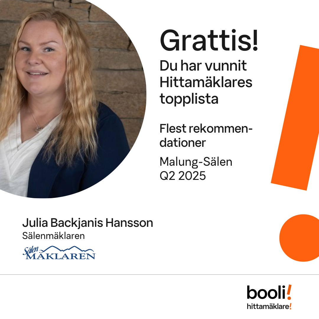 Statistik för publicerade bostäder, försäljningar och omdömen baseras på data från Booli och Hittamäklare. Statistiken för försäljningar avser inrapporterade och verifierade slutpriser från mäklare eller av Booli inhämtade och verifierade slutpriser. Statistiken för publicerade bostäder baseras på information som publicerats på Booli.se. Statistik för omdömen och rekommendationer baseras på omdömen från säljare som lämnats via Booli och Hittamäklare.