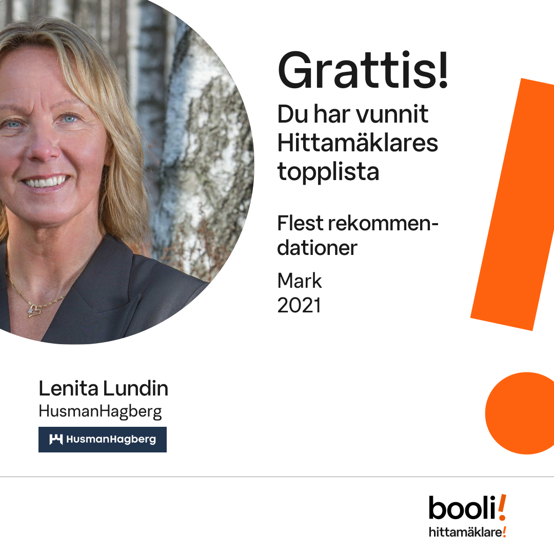 Statistik för publicerade bostäder, försäljningar och omdömen baseras på data från Booli och Hittamäklare. Statistiken för försäljningar avser inrapporterade och verifierade slutpriser från mäklare eller av Booli inhämtade och verifierade slutpriser. Statistiken för publicerade bostäder baseras på information som publicerats på Booli.se. Statistik för omdömen och rekommendationer baseras på omdömen från säljare som lämnats via Booli och Hittamäklare.