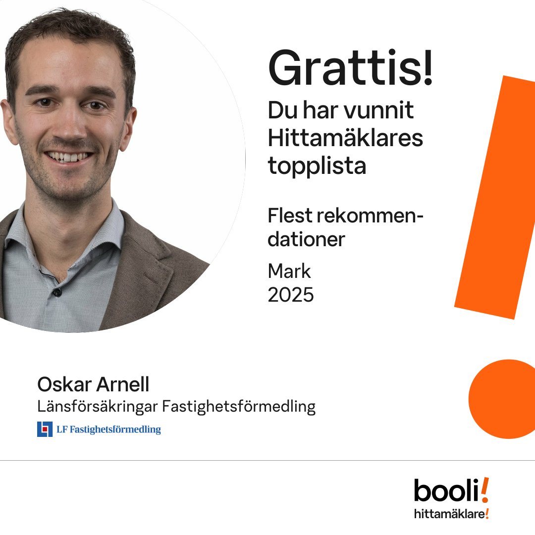 Statistik för publicerade bostäder, försäljningar och omdömen baseras på data från Booli och Hittamäklare. Statistiken för försäljningar avser inrapporterade och verifierade slutpriser från mäklare eller av Booli inhämtade och verifierade slutpriser. Statistiken för publicerade bostäder baseras på information som publicerats på Booli.se. Statistik för omdömen och rekommendationer baseras på omdömen från säljare som lämnats via Booli och Hittamäklare.