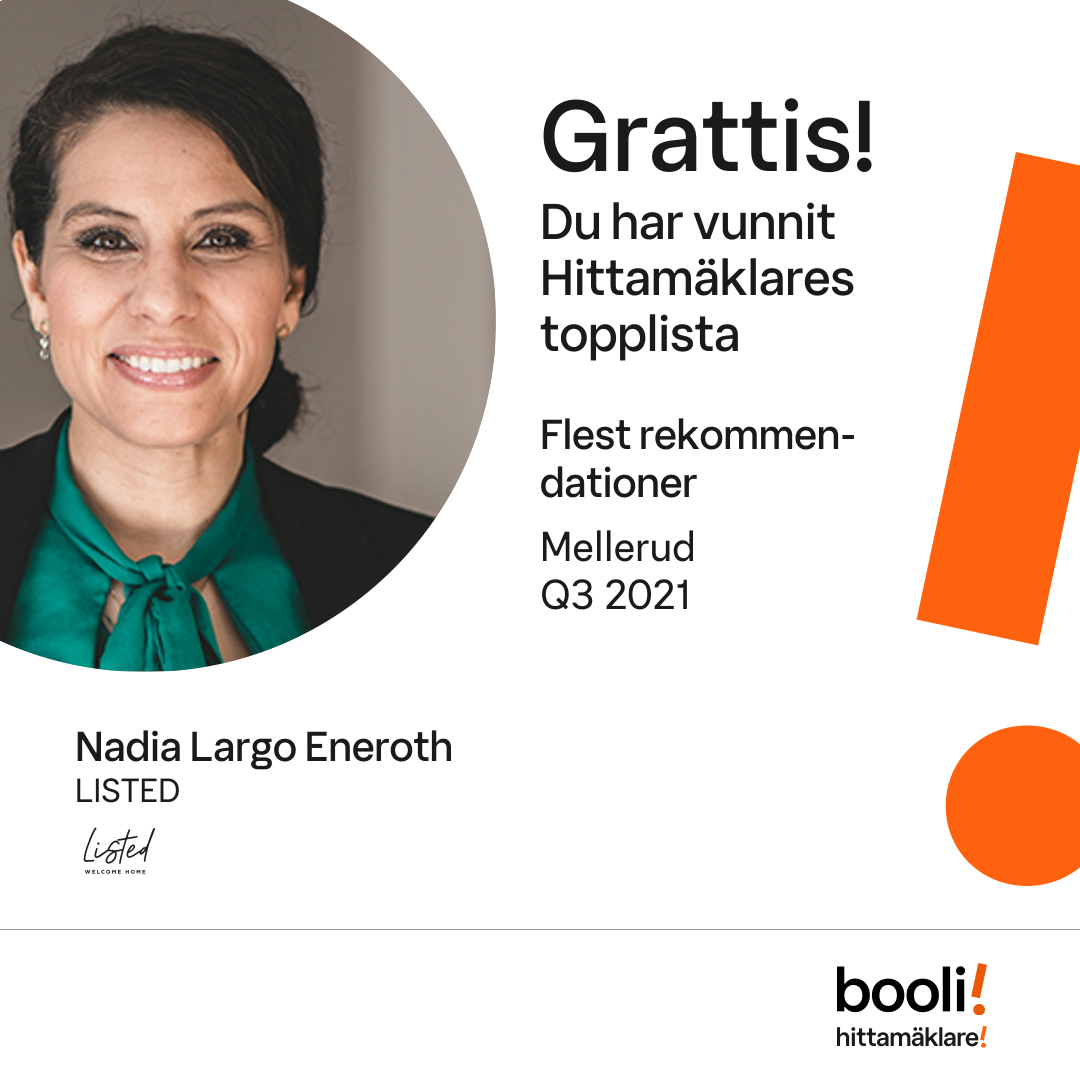 Statistik för publicerade bostäder, försäljningar och omdömen baseras på data från Booli och Hittamäklare. Statistiken för försäljningar avser inrapporterade och verifierade slutpriser från mäklare eller av Booli inhämtade och verifierade slutpriser. Statistiken för publicerade bostäder baseras på information som publicerats på Booli.se. Statistik för omdömen och rekommendationer baseras på omdömen från säljare som lämnats via Booli och Hittamäklare.