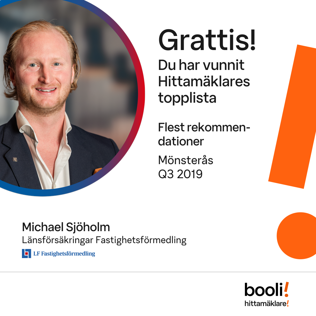 Statistik för publicerade bostäder, försäljningar och omdömen baseras på data från Booli och Hittamäklare. Statistiken för försäljningar avser inrapporterade och verifierade slutpriser från mäklare eller av Booli inhämtade och verifierade slutpriser. Statistiken för publicerade bostäder baseras på information som publicerats på Booli.se. Statistik för omdömen och rekommendationer baseras på omdömen från säljare som lämnats via Booli och Hittamäklare.