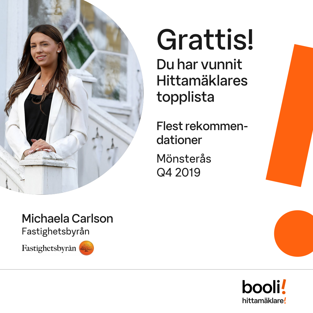Statistik för publicerade bostäder, försäljningar och omdömen baseras på data från Booli och Hittamäklare. Statistiken för försäljningar avser inrapporterade och verifierade slutpriser från mäklare eller av Booli inhämtade och verifierade slutpriser. Statistiken för publicerade bostäder baseras på information som publicerats på Booli.se. Statistik för omdömen och rekommendationer baseras på omdömen från säljare som lämnats via Booli och Hittamäklare.