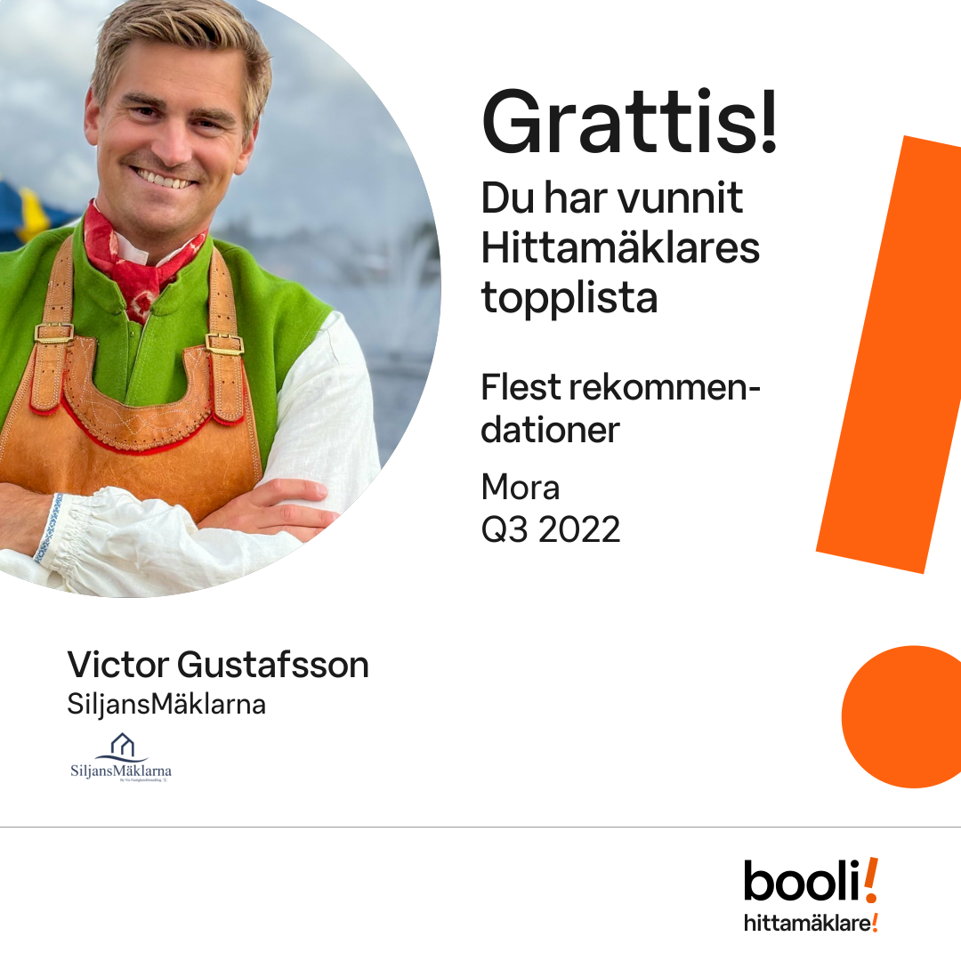 Statistik för publicerade bostäder, försäljningar och omdömen baseras på data från Booli och Hittamäklare. Statistiken för försäljningar avser inrapporterade och verifierade slutpriser från mäklare eller av Booli inhämtade och verifierade slutpriser. Statistiken för publicerade bostäder baseras på information som publicerats på Booli.se. Statistik för omdömen och rekommendationer baseras på omdömen från säljare som lämnats via Booli och Hittamäklare.