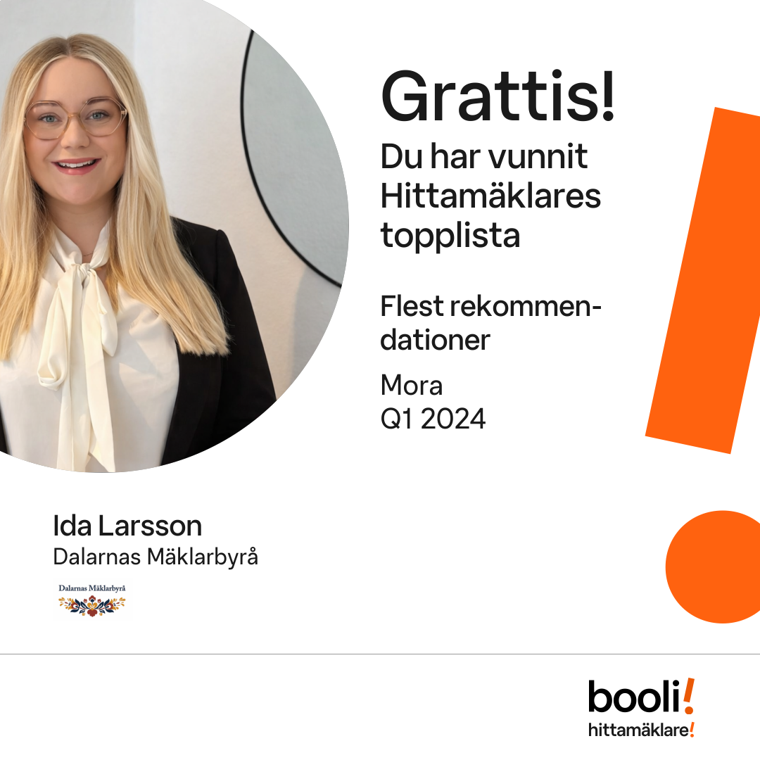 Statistik för publicerade bostäder, försäljningar och omdömen baseras på data från Booli och Hittamäklare. Statistiken för försäljningar avser inrapporterade och verifierade slutpriser från mäklare eller av Booli inhämtade och verifierade slutpriser. Statistiken för publicerade bostäder baseras på information som publicerats på Booli.se. Statistik för omdömen och rekommendationer baseras på omdömen från säljare som lämnats via Booli och Hittamäklare.