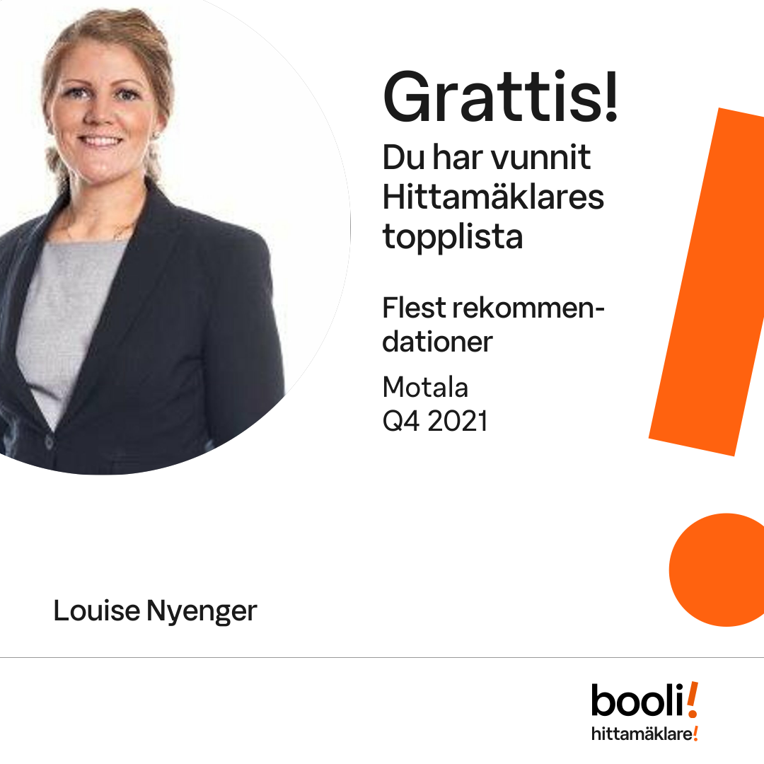 Statistik för publicerade bostäder, försäljningar och omdömen baseras på data från Booli och Hittamäklare. Statistiken för försäljningar avser inrapporterade och verifierade slutpriser från mäklare eller av Booli inhämtade och verifierade slutpriser. Statistiken för publicerade bostäder baseras på information som publicerats på Booli.se. Statistik för omdömen och rekommendationer baseras på omdömen från säljare som lämnats via Booli och Hittamäklare.