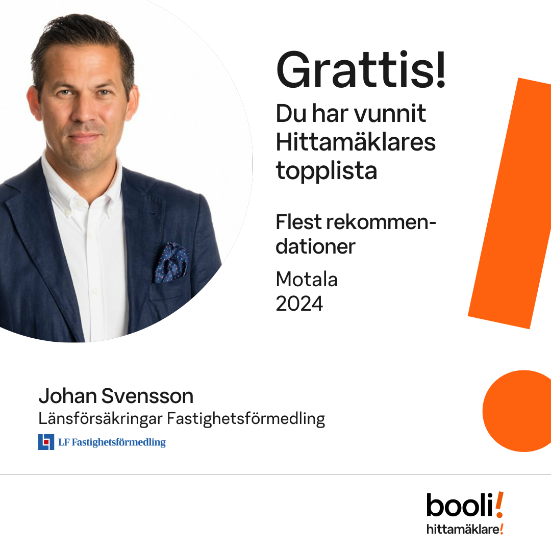 Statistik för publicerade bostäder, försäljningar och omdömen baseras på data från Booli och Hittamäklare. Statistiken för försäljningar avser inrapporterade och verifierade slutpriser från mäklare eller av Booli inhämtade och verifierade slutpriser. Statistiken för publicerade bostäder baseras på information som publicerats på Booli.se. Statistik för omdömen och rekommendationer baseras på omdömen från säljare som lämnats via Booli och Hittamäklare.
