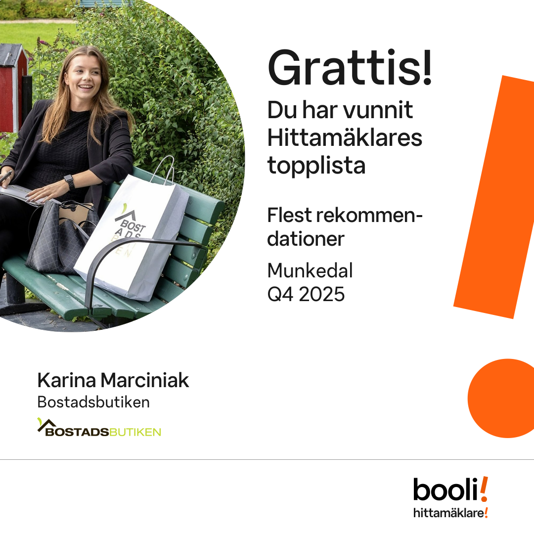 Statistik för publicerade bostäder, försäljningar och omdömen baseras på data från Booli och Hittamäklare. Statistiken för försäljningar avser inrapporterade och verifierade slutpriser från mäklare eller av Booli inhämtade och verifierade slutpriser. Statistiken för publicerade bostäder baseras på information som publicerats på Booli.se. Statistik för omdömen och rekommendationer baseras på omdömen från säljare som lämnats via Booli och Hittamäklare.