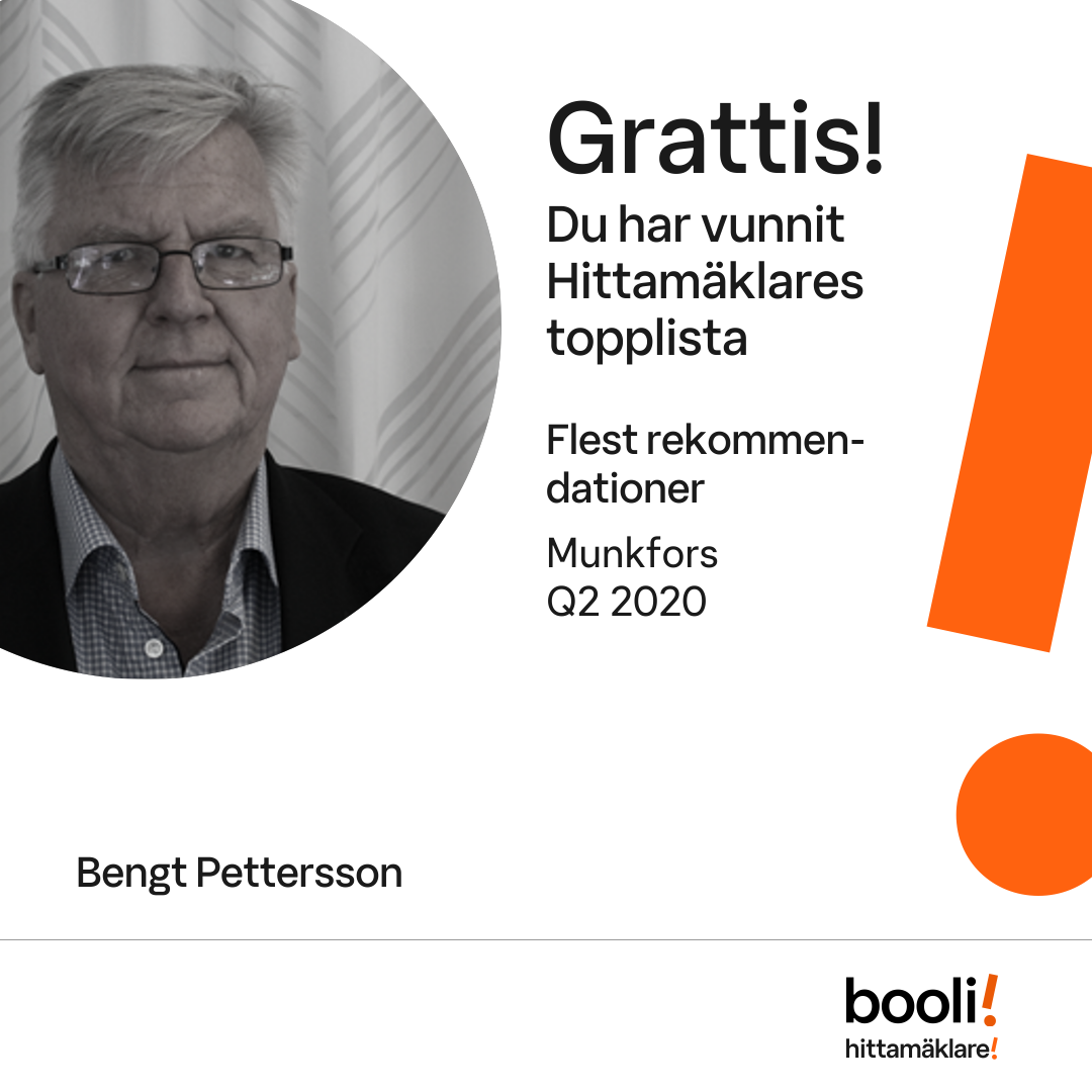 Statistik för publicerade bostäder, försäljningar och omdömen baseras på data från Booli och Hittamäklare. Statistiken för försäljningar avser inrapporterade och verifierade slutpriser från mäklare eller av Booli inhämtade och verifierade slutpriser. Statistiken för publicerade bostäder baseras på information som publicerats på Booli.se. Statistik för omdömen och rekommendationer baseras på omdömen från säljare som lämnats via Booli och Hittamäklare.