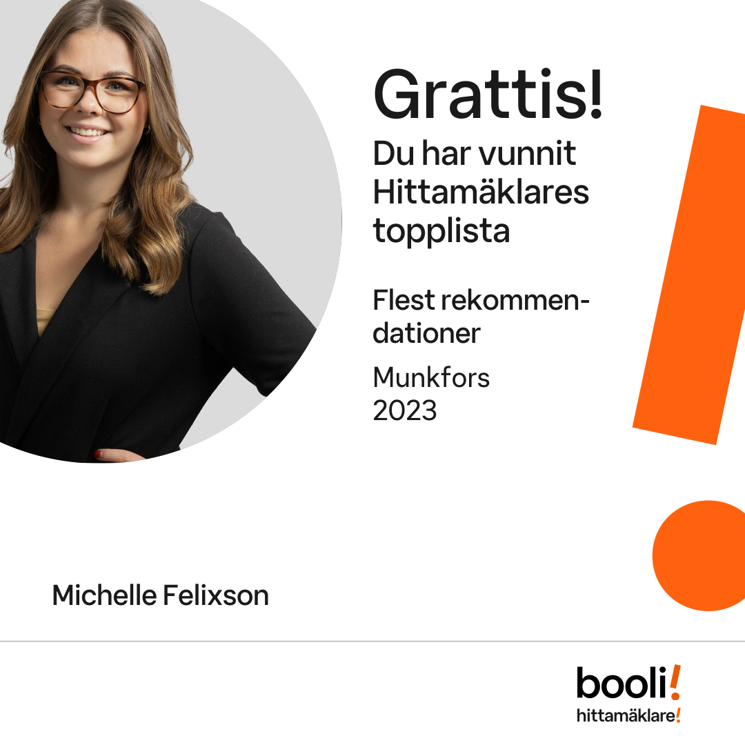 Statistik för publicerade bostäder, försäljningar och omdömen baseras på data från Booli och Hittamäklare. Statistiken för försäljningar avser inrapporterade och verifierade slutpriser från mäklare eller av Booli inhämtade och verifierade slutpriser. Statistiken för publicerade bostäder baseras på information som publicerats på Booli.se. Statistik för omdömen och rekommendationer baseras på omdömen från säljare som lämnats via Booli och Hittamäklare.