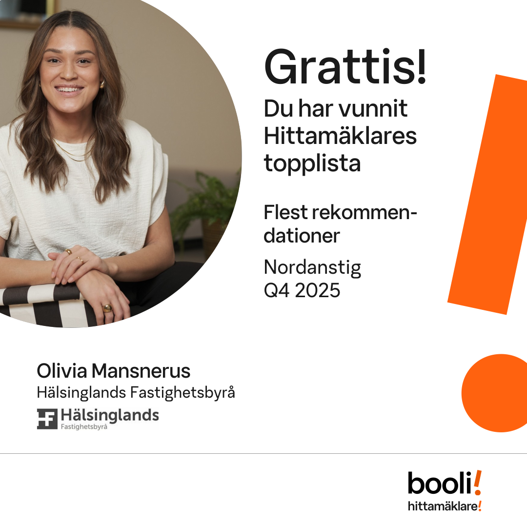Statistik för publicerade bostäder, försäljningar och omdömen baseras på data från Booli. Statistiken för försäljningar avser inrapporterade och verifierade slutpriser från mäklare eller av Booli inhämtade och verifierade slutpriser. Statistiken för publicerade bostäder baseras på information som publicerats på Booli.se. Statistik för omdömen och rekommendationer baseras på omdömen från säljare som lämnats via Booli.