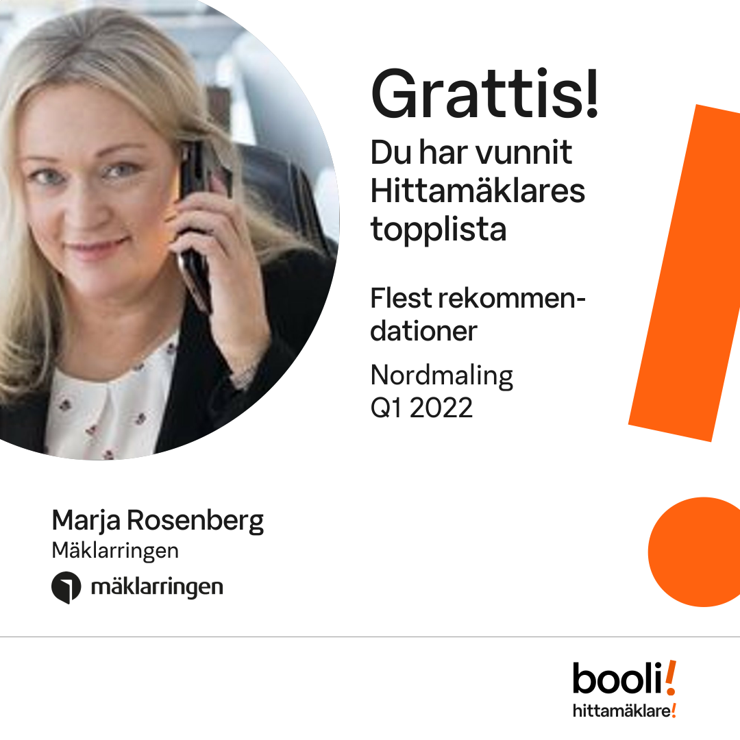 Statistik för publicerade bostäder, försäljningar och omdömen baseras på data från Booli och Hittamäklare. Statistiken för försäljningar avser inrapporterade och verifierade slutpriser från mäklare eller av Booli inhämtade och verifierade slutpriser. Statistiken för publicerade bostäder baseras på information som publicerats på Booli.se. Statistik för omdömen och rekommendationer baseras på omdömen från säljare som lämnats via Booli och Hittamäklare.