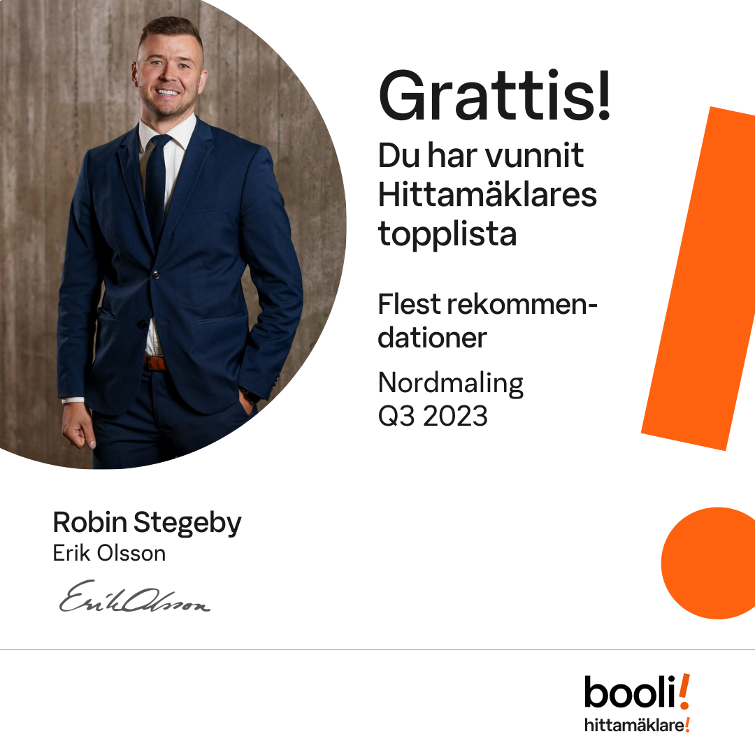 Statistik för publicerade bostäder, försäljningar och omdömen baseras på data från Booli och Hittamäklare. Statistiken för försäljningar avser inrapporterade och verifierade slutpriser från mäklare eller av Booli inhämtade och verifierade slutpriser. Statistiken för publicerade bostäder baseras på information som publicerats på Booli.se. Statistik för omdömen och rekommendationer baseras på omdömen från säljare som lämnats via Booli och Hittamäklare.