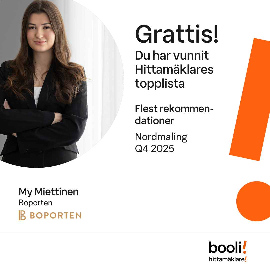 Statistik för publicerade bostäder, försäljningar och omdömen baseras på data från Booli och Hittamäklare. Statistiken för försäljningar avser inrapporterade och verifierade slutpriser från mäklare eller av Booli inhämtade och verifierade slutpriser. Statistiken för publicerade bostäder baseras på information som publicerats på Booli.se. Statistik för omdömen och rekommendationer baseras på omdömen från säljare som lämnats via Booli och Hittamäklare.