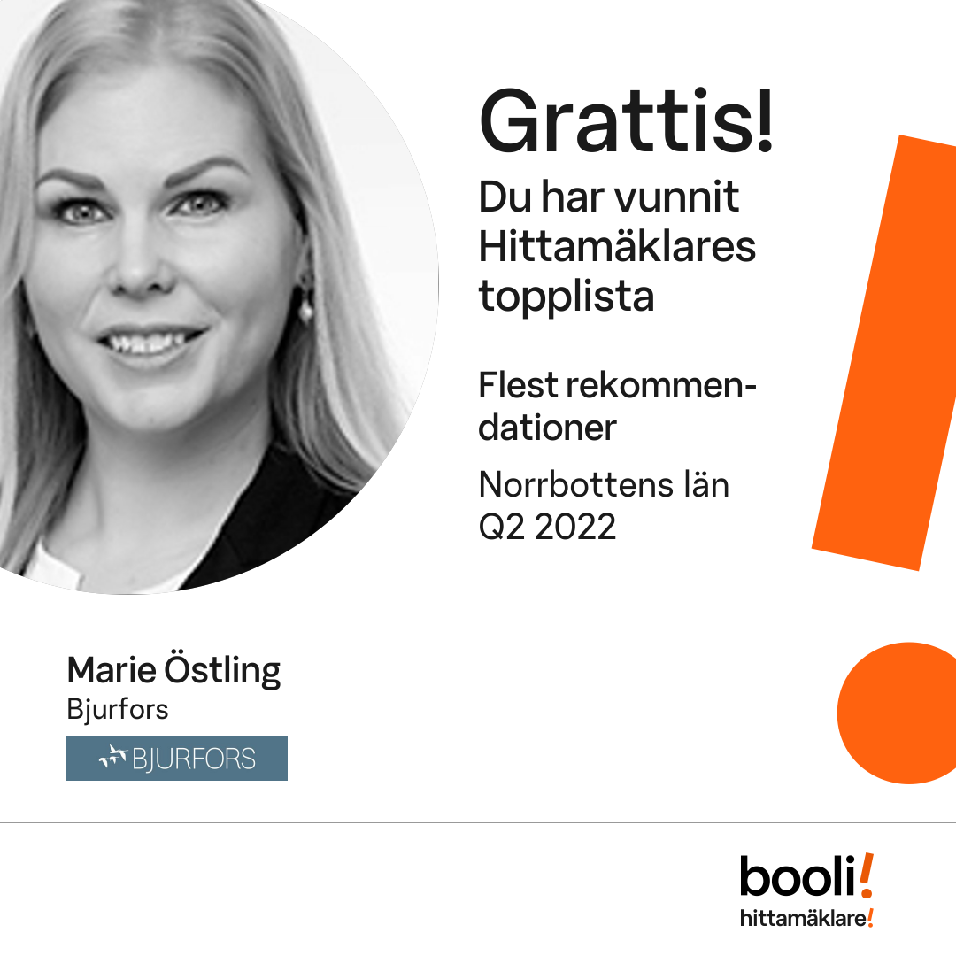 Statistik för publicerade bostäder, försäljningar och omdömen baseras på data från Booli och Hittamäklare. Statistiken för försäljningar avser inrapporterade och verifierade slutpriser från mäklare eller av Booli inhämtade och verifierade slutpriser. Statistiken för publicerade bostäder baseras på information som publicerats på Booli.se. Statistik för omdömen och rekommendationer baseras på omdömen från säljare som lämnats via Booli och Hittamäklare.