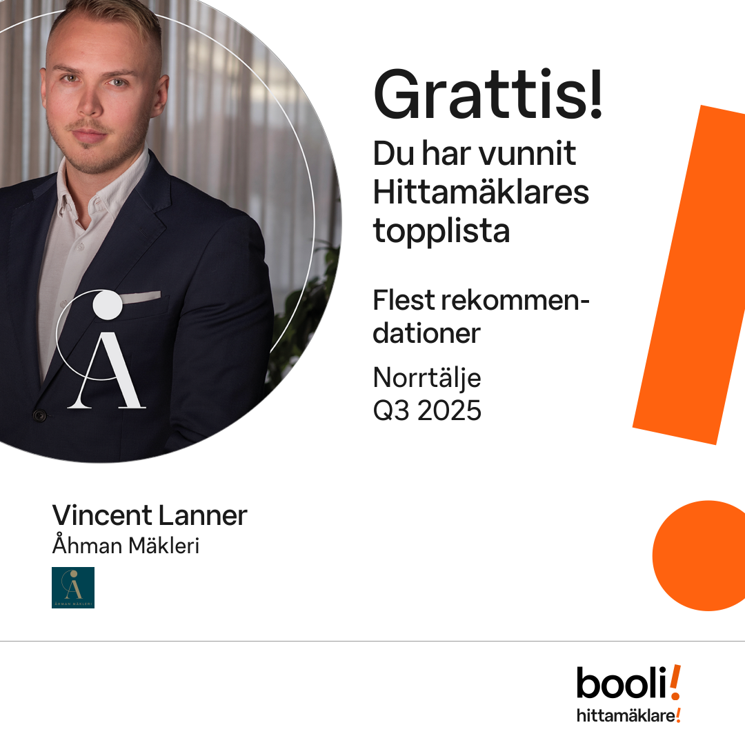 Statistik för publicerade bostäder, försäljningar och omdömen baseras på data från Booli och Hittamäklare. Statistiken för försäljningar avser inrapporterade och verifierade slutpriser från mäklare eller av Booli inhämtade och verifierade slutpriser. Statistiken för publicerade bostäder baseras på information som publicerats på Booli.se. Statistik för omdömen och rekommendationer baseras på omdömen från säljare som lämnats via Booli och Hittamäklare.