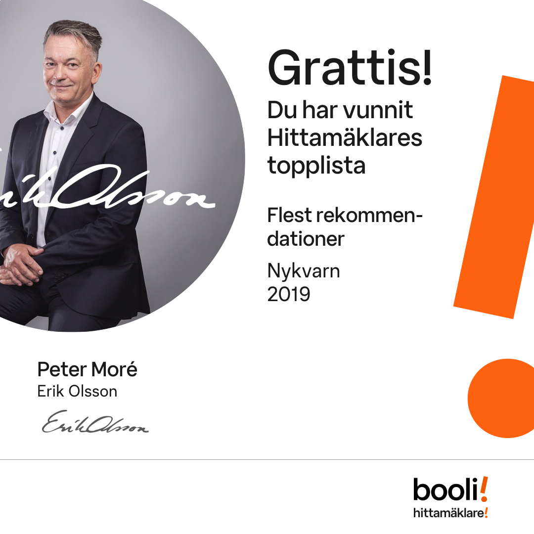 Statistik för publicerade bostäder, försäljningar och omdömen baseras på data från Booli och Hittamäklare. Statistiken för försäljningar avser inrapporterade och verifierade slutpriser från mäklare eller av Booli inhämtade och verifierade slutpriser. Statistiken för publicerade bostäder baseras på information som publicerats på Booli.se. Statistik för omdömen och rekommendationer baseras på omdömen från säljare som lämnats via Booli och Hittamäklare.