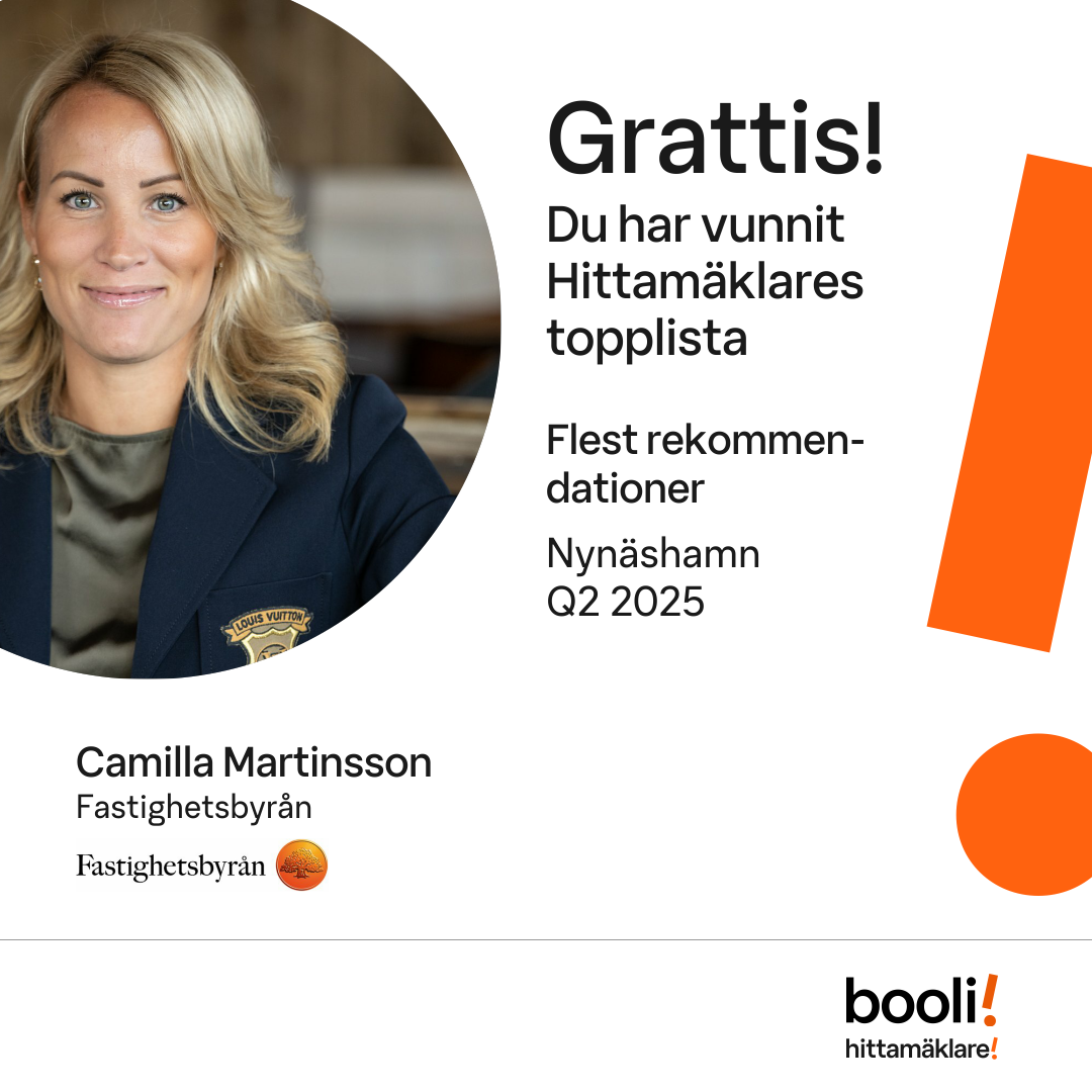 Statistik för publicerade bostäder, försäljningar och omdömen baseras på data från Booli och Hittamäklare. Statistiken för försäljningar avser inrapporterade och verifierade slutpriser från mäklare eller av Booli inhämtade och verifierade slutpriser. Statistiken för publicerade bostäder baseras på information som publicerats på Booli.se. Statistik för omdömen och rekommendationer baseras på omdömen från säljare som lämnats via Booli och Hittamäklare.
