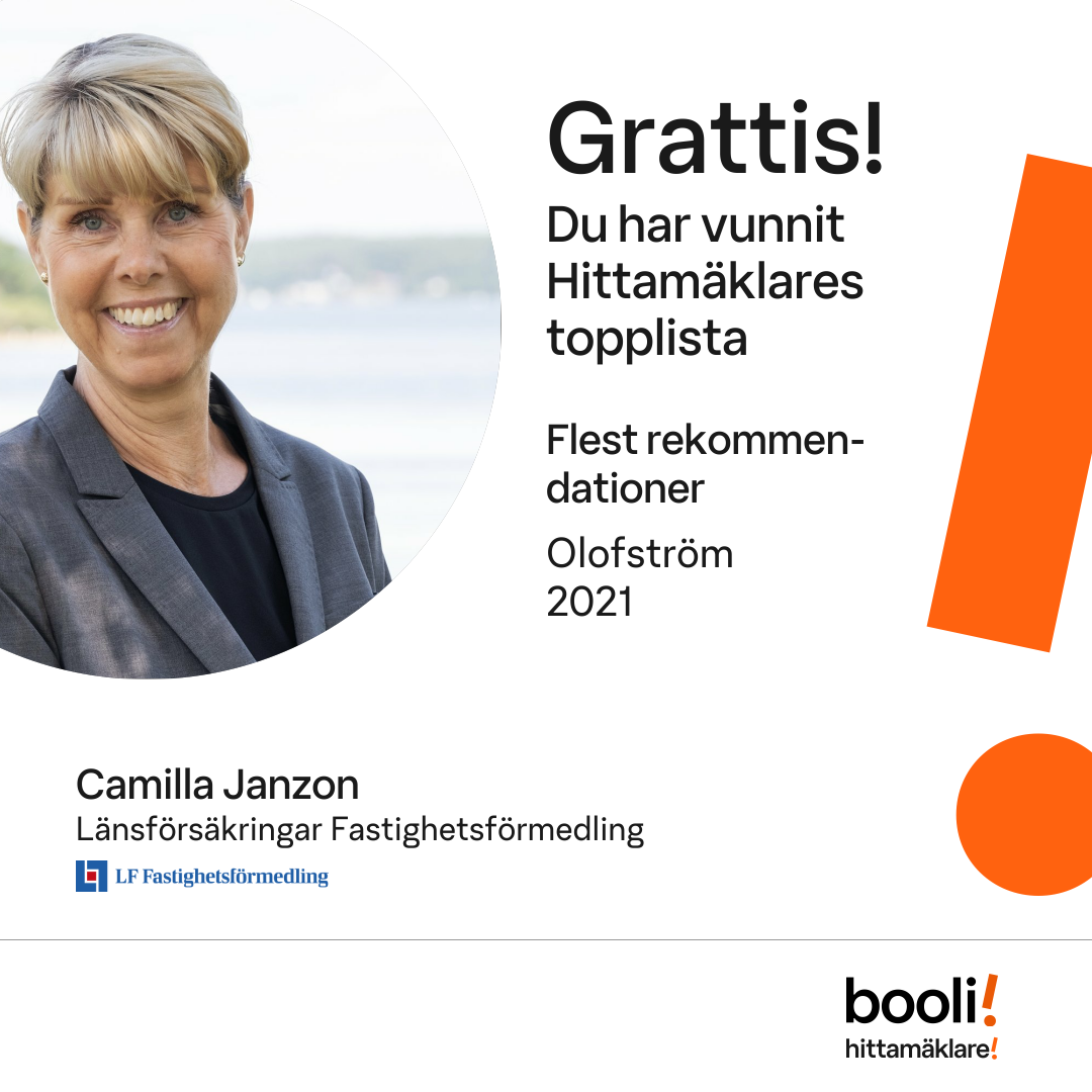 Statistik för publicerade bostäder, försäljningar och omdömen baseras på data från Booli och Hittamäklare. Statistiken för försäljningar avser inrapporterade och verifierade slutpriser från mäklare eller av Booli inhämtade och verifierade slutpriser. Statistiken för publicerade bostäder baseras på information som publicerats på Booli.se. Statistik för omdömen och rekommendationer baseras på omdömen från säljare som lämnats via Booli och Hittamäklare.