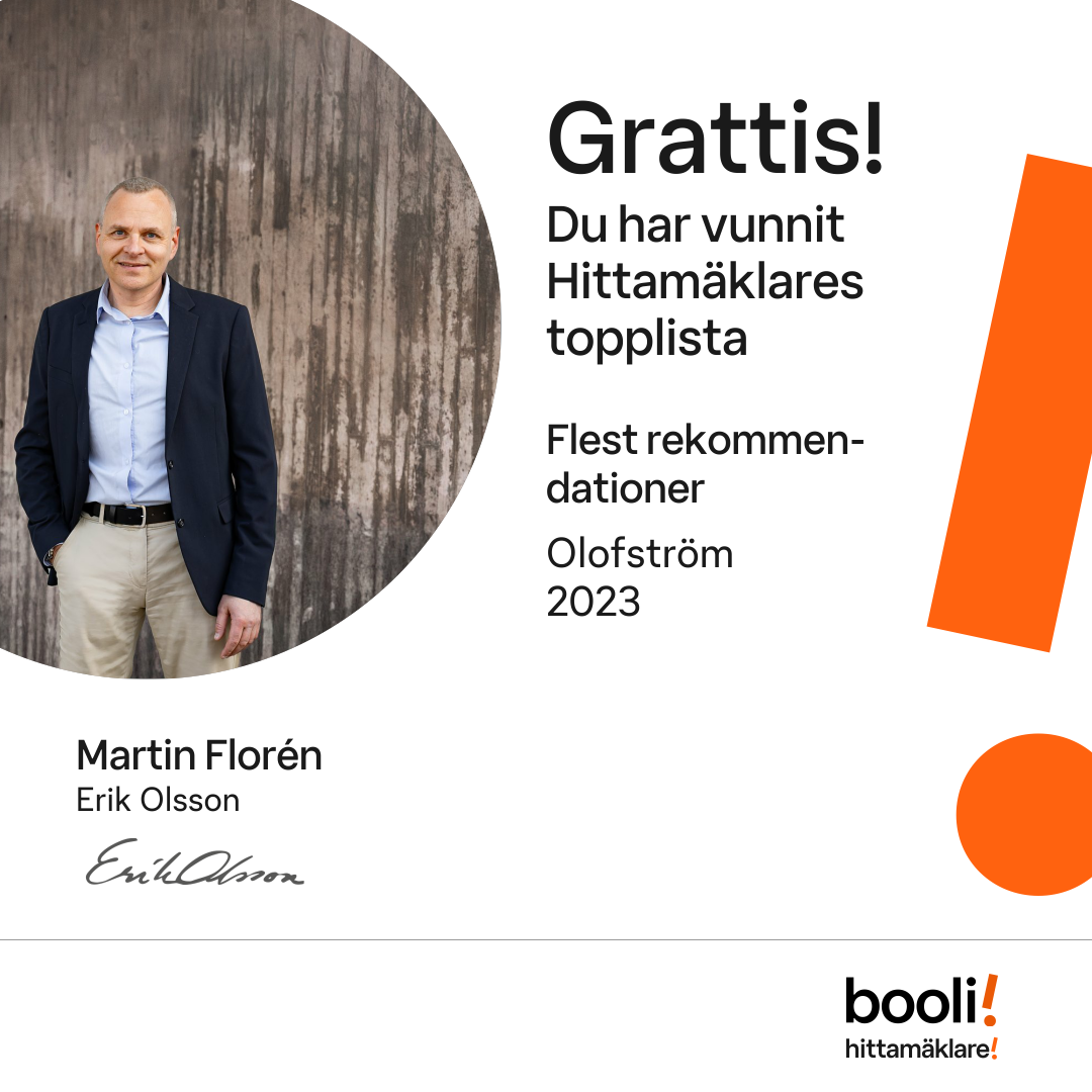 Statistik för publicerade bostäder, försäljningar och omdömen baseras på data från Booli och Hittamäklare. Statistiken för försäljningar avser inrapporterade och verifierade slutpriser från mäklare eller av Booli inhämtade och verifierade slutpriser. Statistiken för publicerade bostäder baseras på information som publicerats på Booli.se. Statistik för omdömen och rekommendationer baseras på omdömen från säljare som lämnats via Booli och Hittamäklare.