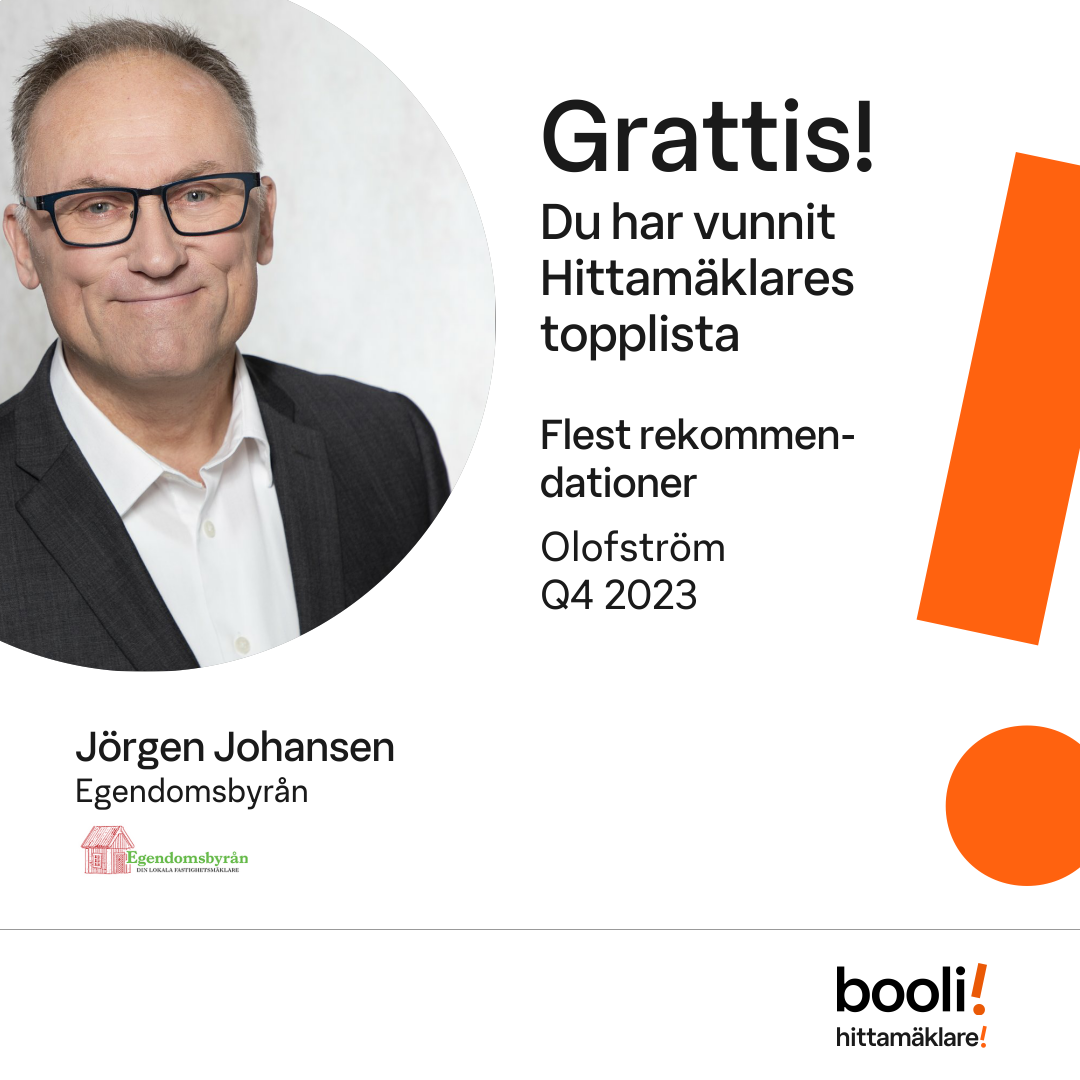 Statistik för publicerade bostäder, försäljningar och omdömen baseras på data från Booli och Hittamäklare. Statistiken för försäljningar avser inrapporterade och verifierade slutpriser från mäklare eller av Booli inhämtade och verifierade slutpriser. Statistiken för publicerade bostäder baseras på information som publicerats på Booli.se. Statistik för omdömen och rekommendationer baseras på omdömen från säljare som lämnats via Booli och Hittamäklare.