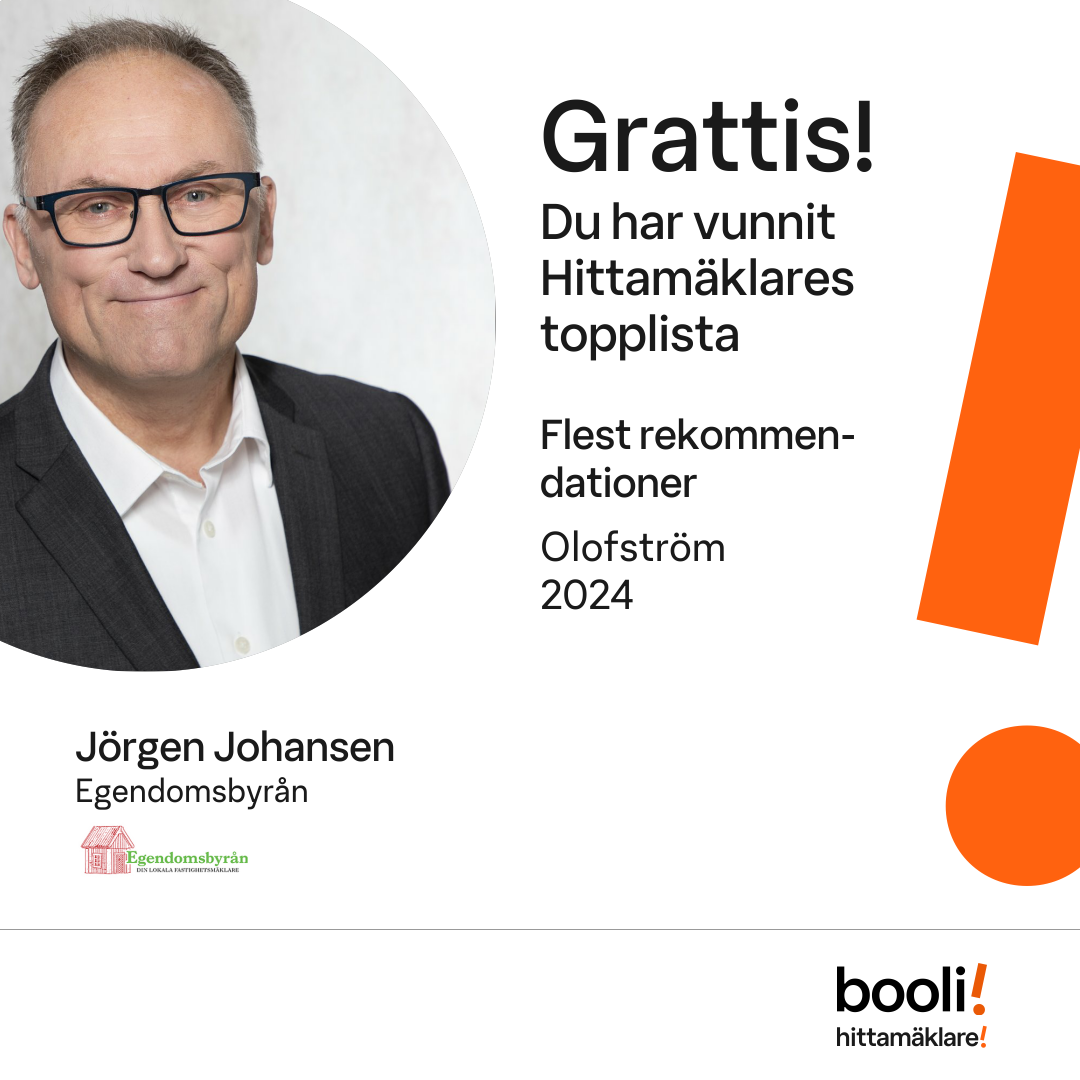 Statistik för publicerade bostäder, försäljningar och omdömen baseras på data från Booli och Hittamäklare. Statistiken för försäljningar avser inrapporterade och verifierade slutpriser från mäklare eller av Booli inhämtade och verifierade slutpriser. Statistiken för publicerade bostäder baseras på information som publicerats på Booli.se. Statistik för omdömen och rekommendationer baseras på omdömen från säljare som lämnats via Booli och Hittamäklare.