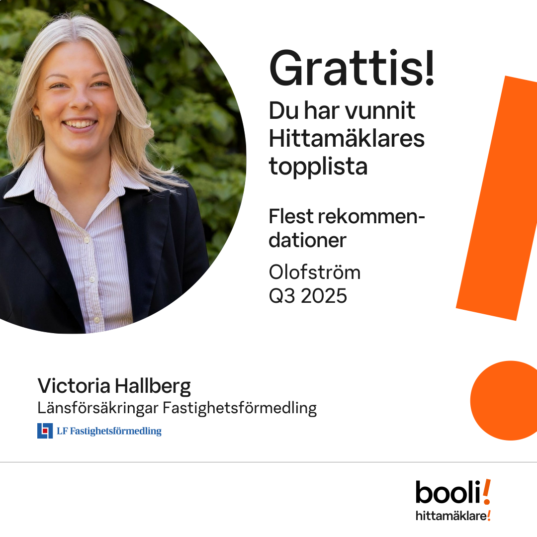 Statistik för publicerade bostäder, försäljningar och omdömen baseras på data från Booli och Hittamäklare. Statistiken för försäljningar avser inrapporterade och verifierade slutpriser från mäklare eller av Booli inhämtade och verifierade slutpriser. Statistiken för publicerade bostäder baseras på information som publicerats på Booli.se. Statistik för omdömen och rekommendationer baseras på omdömen från säljare som lämnats via Booli och Hittamäklare.