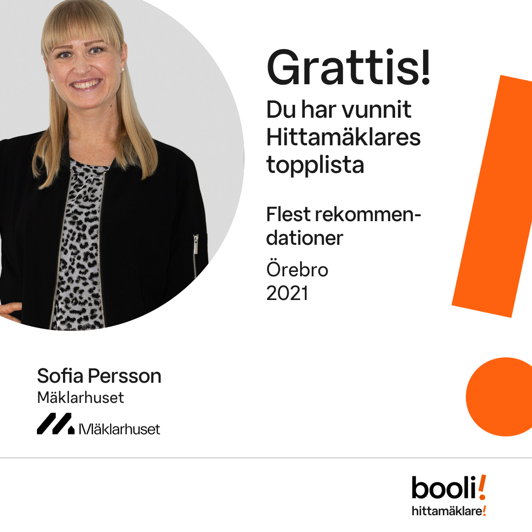 Statistik för publicerade bostäder, försäljningar och omdömen baseras på data från Booli och Hittamäklare. Statistiken för försäljningar avser inrapporterade och verifierade slutpriser från mäklare eller av Booli inhämtade och verifierade slutpriser. Statistiken för publicerade bostäder baseras på information som publicerats på Booli.se. Statistik för omdömen och rekommendationer baseras på omdömen från säljare som lämnats via Booli och Hittamäklare.