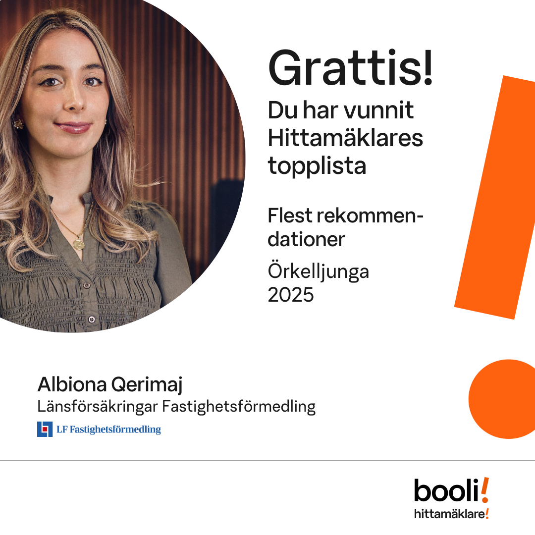 Statistik för publicerade bostäder, försäljningar och omdömen baseras på data från Booli och Hittamäklare. Statistiken för försäljningar avser inrapporterade och verifierade slutpriser från mäklare eller av Booli inhämtade och verifierade slutpriser. Statistiken för publicerade bostäder baseras på information som publicerats på Booli.se. Statistik för omdömen och rekommendationer baseras på omdömen från säljare som lämnats via Booli och Hittamäklare.