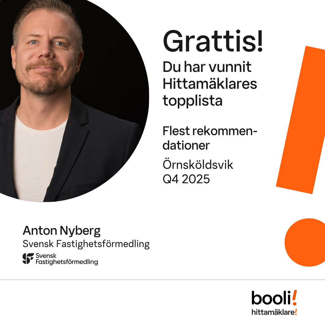 Statistik för publicerade bostäder, försäljningar och omdömen baseras på data från Booli och Hittamäklare. Statistiken för försäljningar avser inrapporterade och verifierade slutpriser från mäklare eller av Booli inhämtade och verifierade slutpriser. Statistiken för publicerade bostäder baseras på information som publicerats på Booli.se. Statistik för omdömen och rekommendationer baseras på omdömen från säljare som lämnats via Booli och Hittamäklare.