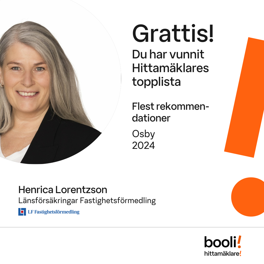 Statistik för publicerade bostäder, försäljningar och omdömen baseras på data från Booli och Hittamäklare. Statistiken för försäljningar avser inrapporterade och verifierade slutpriser från mäklare eller av Booli inhämtade och verifierade slutpriser. Statistiken för publicerade bostäder baseras på information som publicerats på Booli.se. Statistik för omdömen och rekommendationer baseras på omdömen från säljare som lämnats via Booli och Hittamäklare.