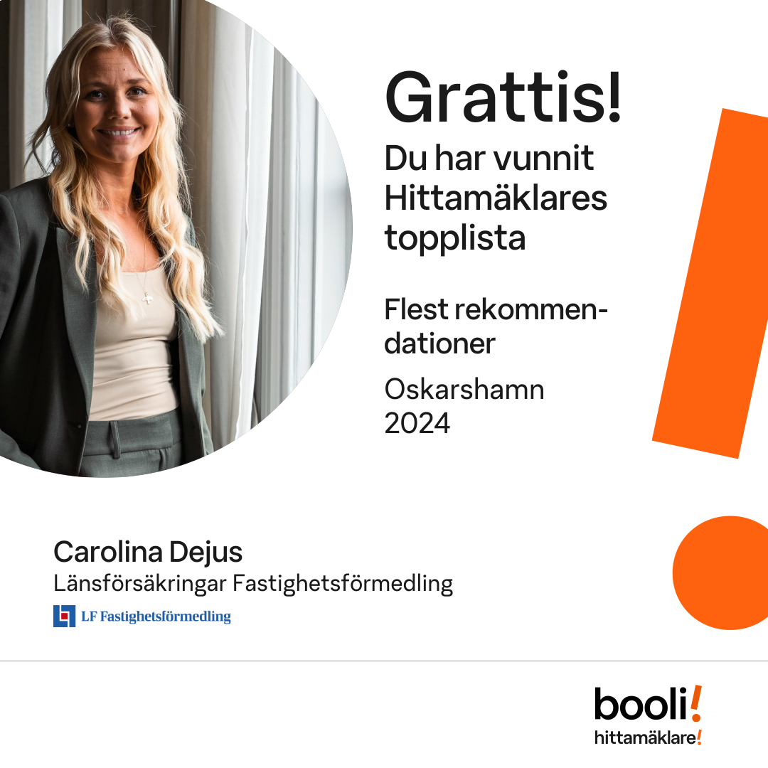 Statistik för publicerade bostäder, försäljningar och omdömen baseras på data från Booli och Hittamäklare. Statistiken för försäljningar avser inrapporterade och verifierade slutpriser från mäklare eller av Booli inhämtade och verifierade slutpriser. Statistiken för publicerade bostäder baseras på information som publicerats på Booli.se. Statistik för omdömen och rekommendationer baseras på omdömen från säljare som lämnats via Booli och Hittamäklare.