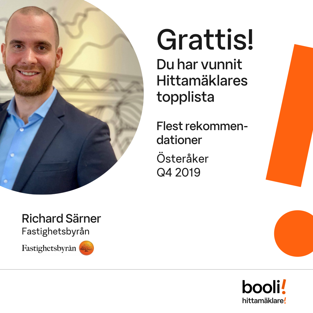 Statistik för publicerade bostäder, försäljningar och omdömen baseras på data från Booli och Hittamäklare. Statistiken för försäljningar avser inrapporterade och verifierade slutpriser från mäklare eller av Booli inhämtade och verifierade slutpriser. Statistiken för publicerade bostäder baseras på information som publicerats på Booli.se. Statistik för omdömen och rekommendationer baseras på omdömen från säljare som lämnats via Booli och Hittamäklare.