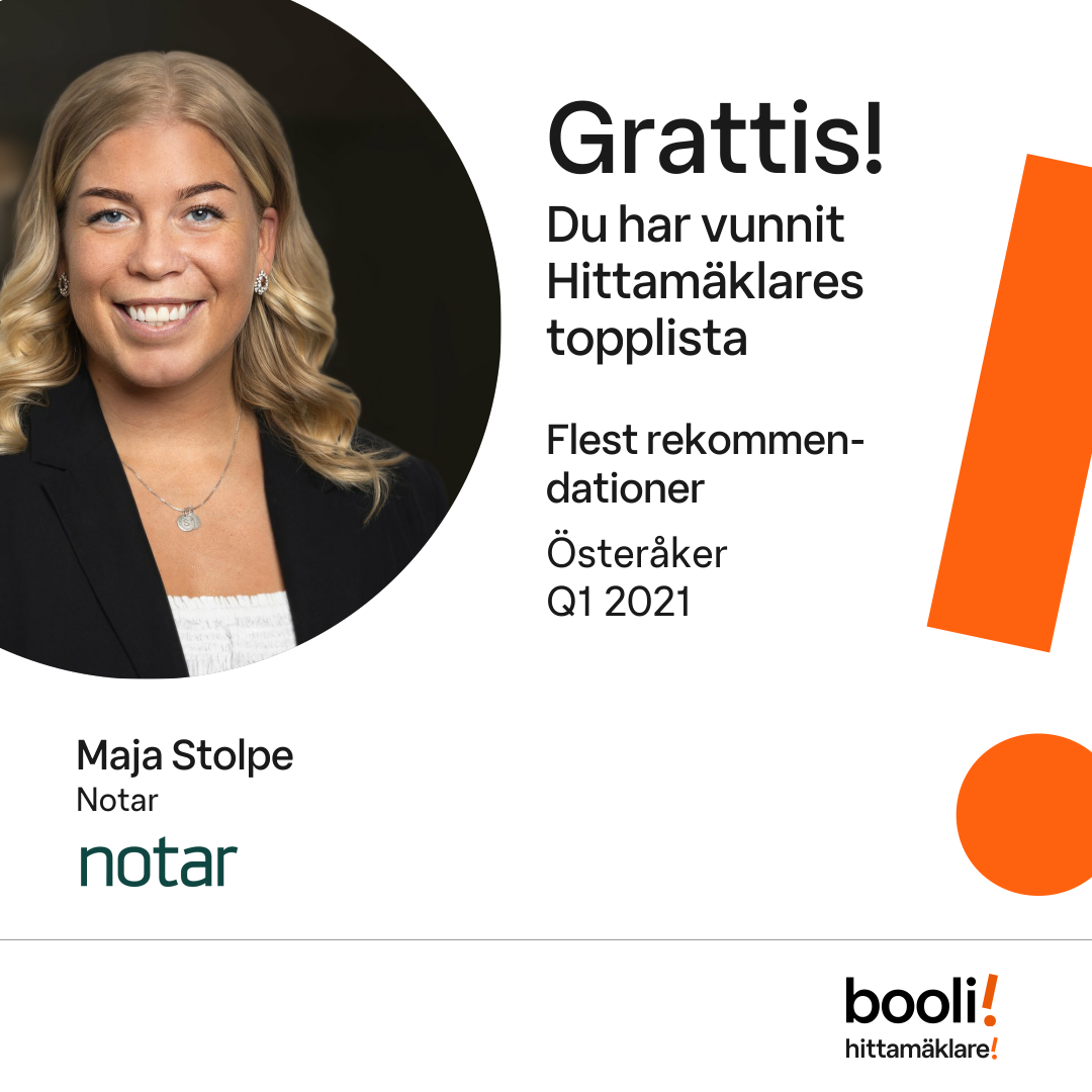 Statistik för publicerade bostäder, försäljningar och omdömen baseras på data från Booli och Hittamäklare. Statistiken för försäljningar avser inrapporterade och verifierade slutpriser från mäklare eller av Booli inhämtade och verifierade slutpriser. Statistiken för publicerade bostäder baseras på information som publicerats på Booli.se. Statistik för omdömen och rekommendationer baseras på omdömen från säljare som lämnats via Booli och Hittamäklare.