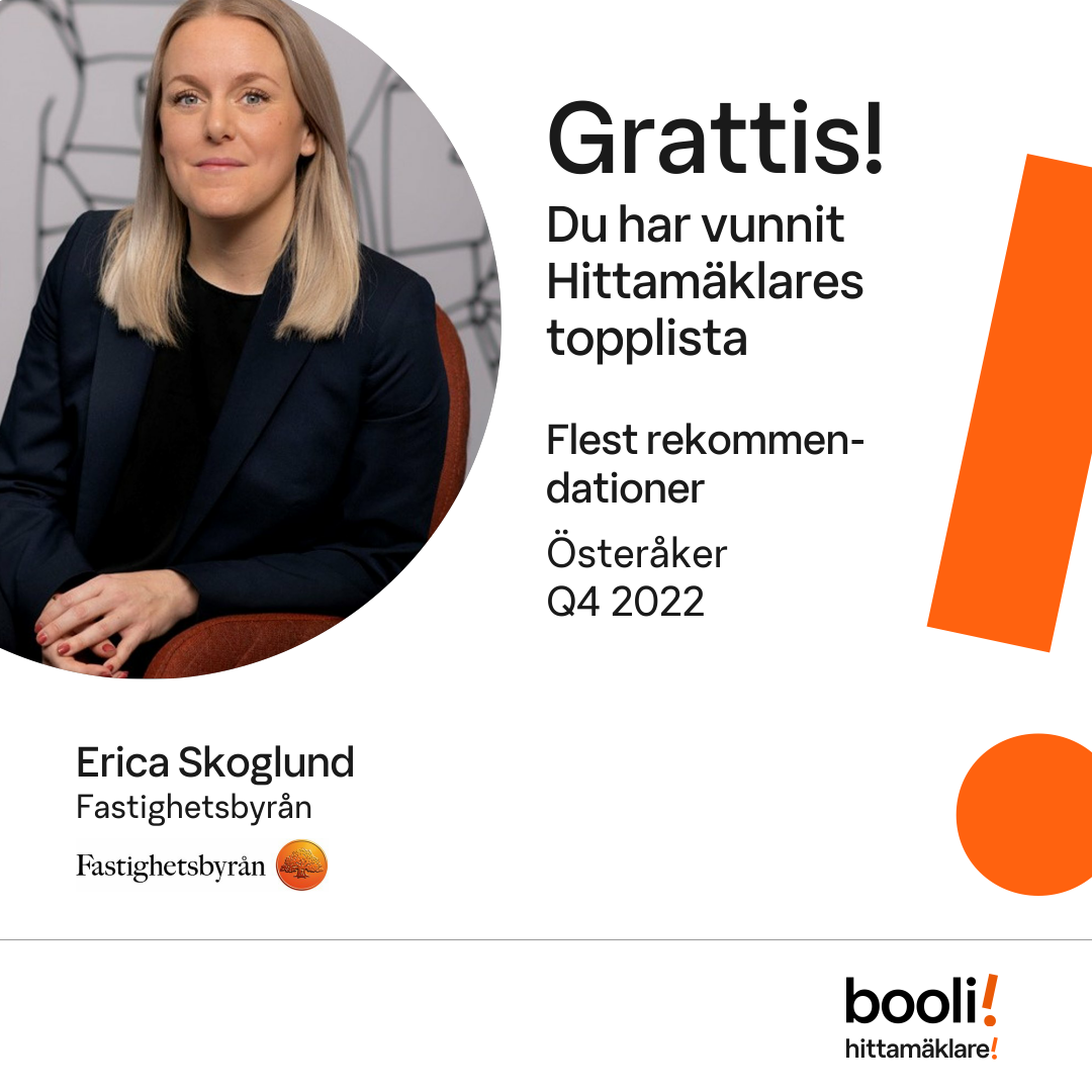 Statistik för publicerade bostäder, försäljningar och omdömen baseras på data från Booli och Hittamäklare. Statistiken för försäljningar avser inrapporterade och verifierade slutpriser från mäklare eller av Booli inhämtade och verifierade slutpriser. Statistiken för publicerade bostäder baseras på information som publicerats på Booli.se. Statistik för omdömen och rekommendationer baseras på omdömen från säljare som lämnats via Booli och Hittamäklare.