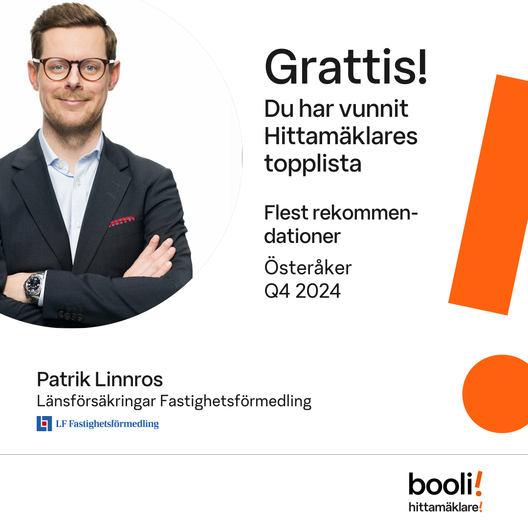 Statistik för publicerade bostäder, försäljningar och omdömen baseras på data från Booli och Hittamäklare. Statistiken för försäljningar avser inrapporterade och verifierade slutpriser från mäklare eller av Booli inhämtade och verifierade slutpriser. Statistiken för publicerade bostäder baseras på information som publicerats på Booli.se. Statistik för omdömen och rekommendationer baseras på omdömen från säljare som lämnats via Booli och Hittamäklare.
