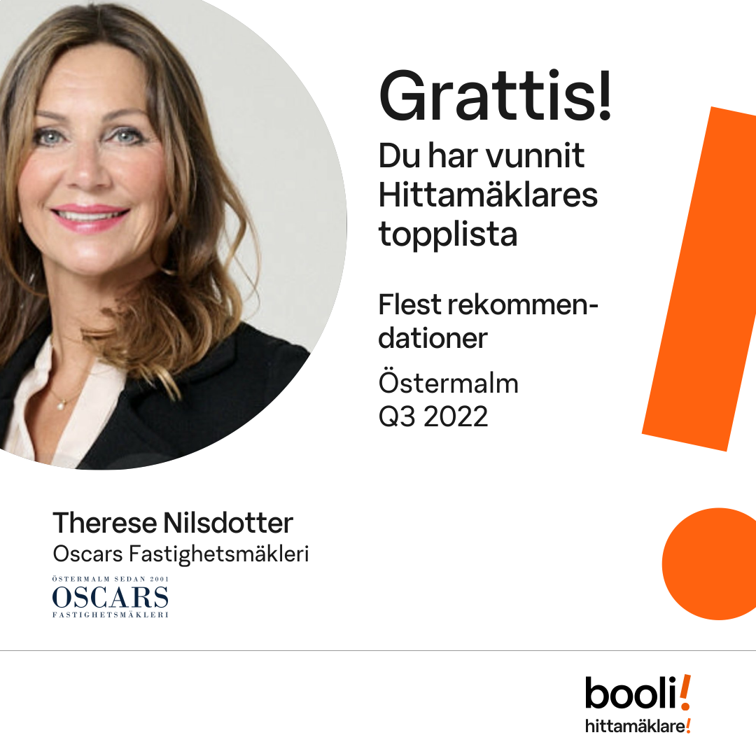 Statistik för publicerade bostäder, försäljningar och omdömen baseras på data från Booli och Hittamäklare. Statistiken för försäljningar avser inrapporterade och verifierade slutpriser från mäklare eller av Booli inhämtade och verifierade slutpriser. Statistiken för publicerade bostäder baseras på information som publicerats på Booli.se. Statistik för omdömen och rekommendationer baseras på omdömen från säljare som lämnats via Booli och Hittamäklare.