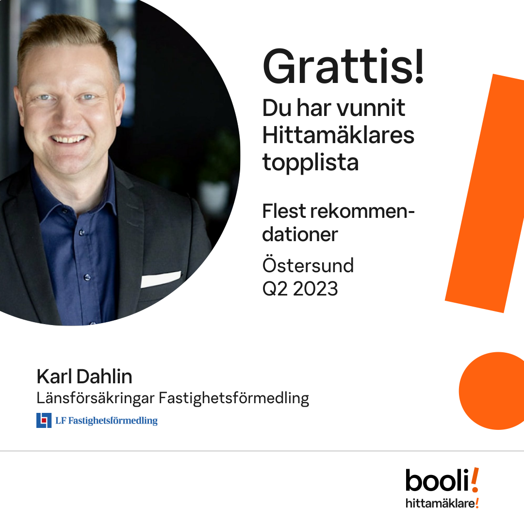 Statistik för publicerade bostäder, försäljningar och omdömen baseras på data från Booli och Hittamäklare. Statistiken för försäljningar avser inrapporterade och verifierade slutpriser från mäklare eller av Booli inhämtade och verifierade slutpriser. Statistiken för publicerade bostäder baseras på information som publicerats på Booli.se. Statistik för omdömen och rekommendationer baseras på omdömen från säljare som lämnats via Booli och Hittamäklare.