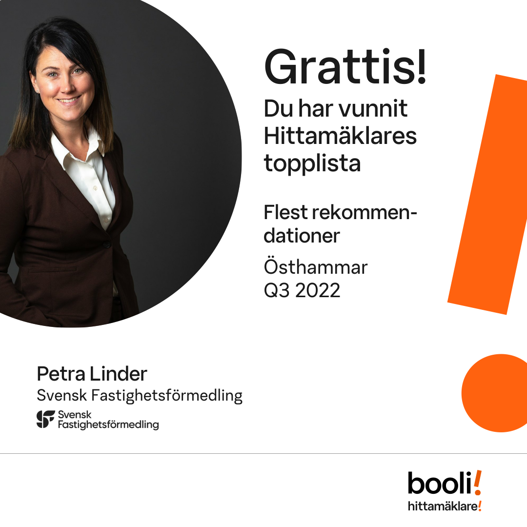 Statistik för publicerade bostäder, försäljningar och omdömen baseras på data från Booli och Hittamäklare. Statistiken för försäljningar avser inrapporterade och verifierade slutpriser från mäklare eller av Booli inhämtade och verifierade slutpriser. Statistiken för publicerade bostäder baseras på information som publicerats på Booli.se. Statistik för omdömen och rekommendationer baseras på omdömen från säljare som lämnats via Booli och Hittamäklare.