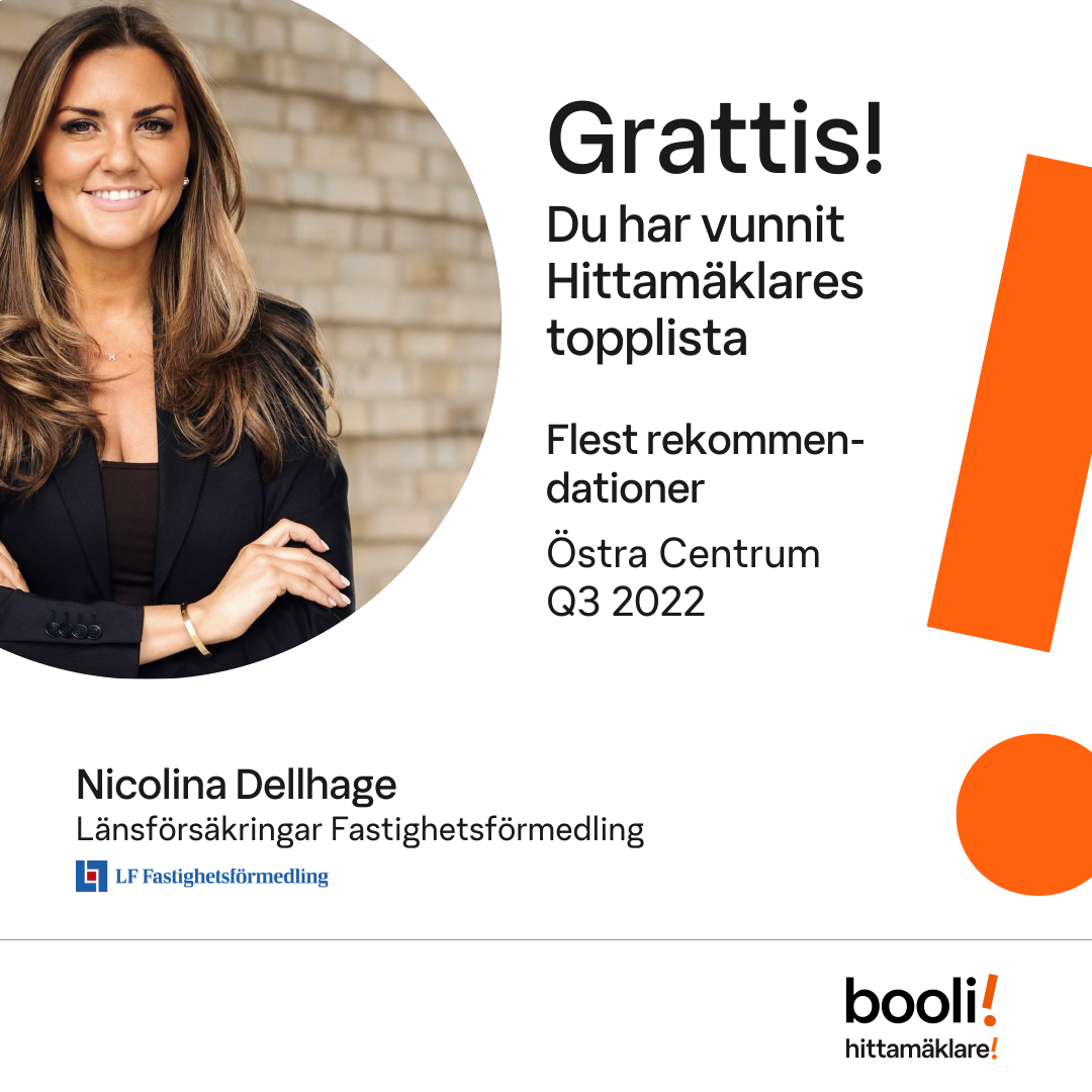 Statistik för publicerade bostäder, försäljningar och omdömen baseras på data från Booli och Hittamäklare. Statistiken för försäljningar avser inrapporterade och verifierade slutpriser från mäklare eller av Booli inhämtade och verifierade slutpriser. Statistiken för publicerade bostäder baseras på information som publicerats på Booli.se. Statistik för omdömen och rekommendationer baseras på omdömen från säljare som lämnats via Booli och Hittamäklare.