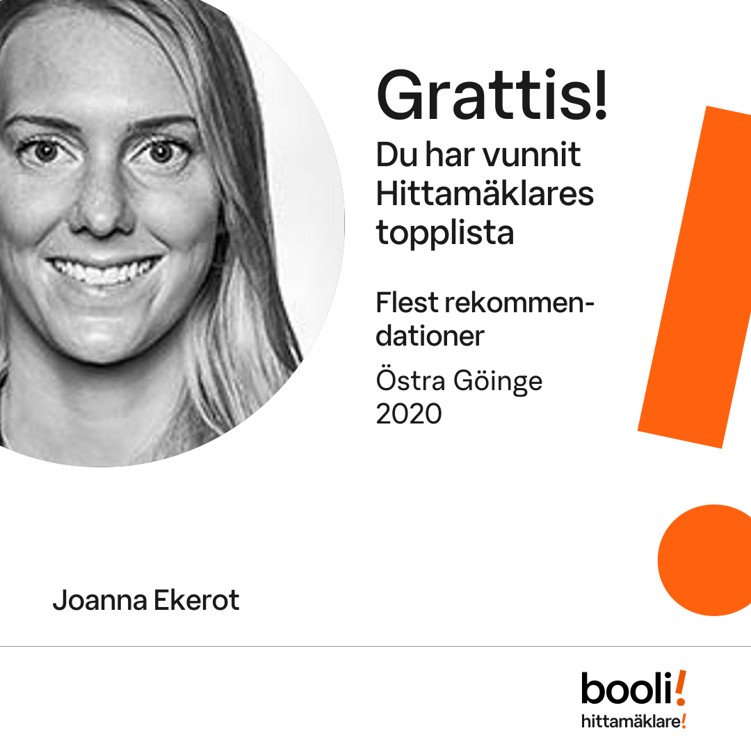Statistik för publicerade bostäder, försäljningar och omdömen baseras på data från Booli och Hittamäklare. Statistiken för försäljningar avser inrapporterade och verifierade slutpriser från mäklare eller av Booli inhämtade och verifierade slutpriser. Statistiken för publicerade bostäder baseras på information som publicerats på Booli.se. Statistik för omdömen och rekommendationer baseras på omdömen från säljare som lämnats via Booli och Hittamäklare.