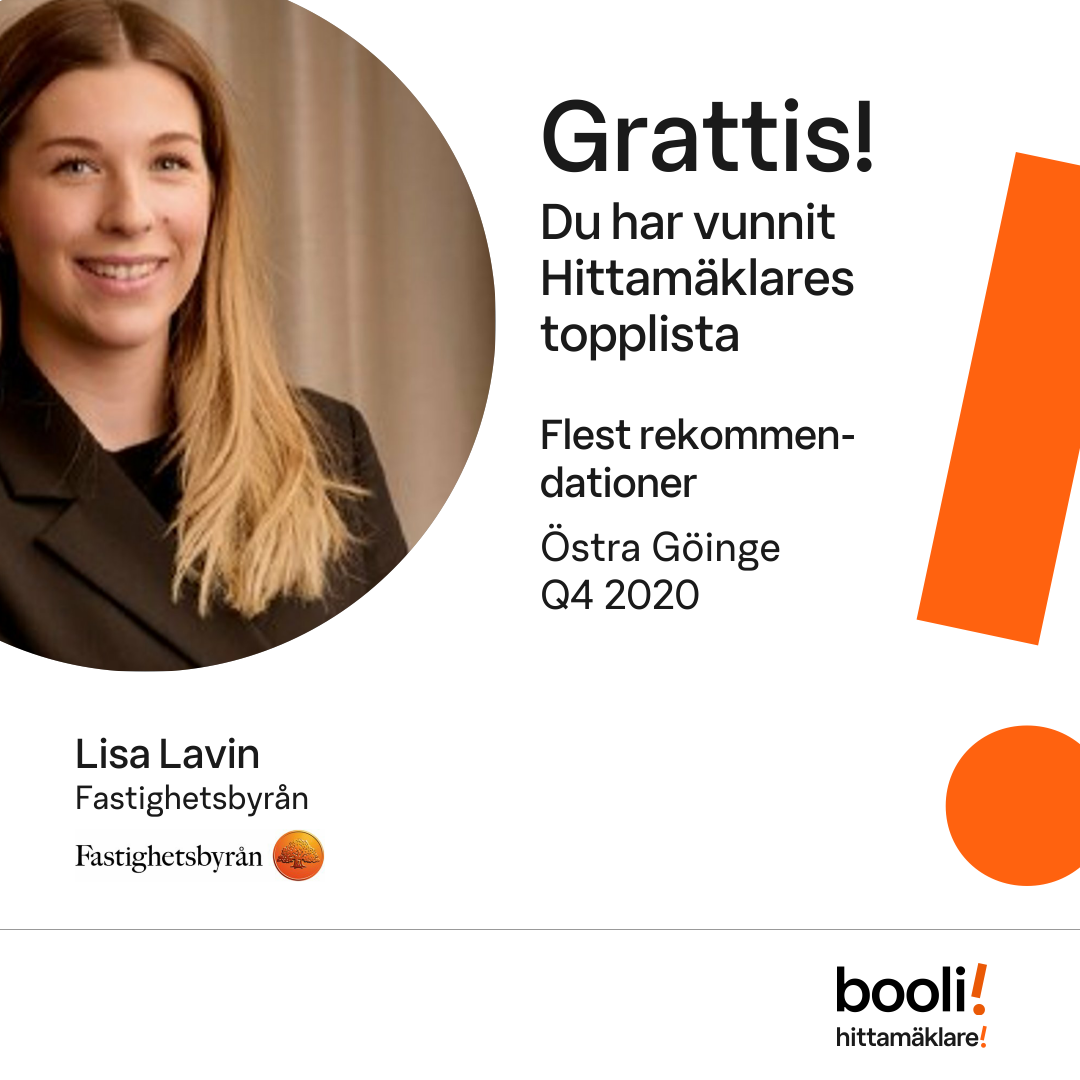 Statistik för publicerade bostäder, försäljningar och omdömen baseras på data från Booli och Hittamäklare. Statistiken för försäljningar avser inrapporterade och verifierade slutpriser från mäklare eller av Booli inhämtade och verifierade slutpriser. Statistiken för publicerade bostäder baseras på information som publicerats på Booli.se. Statistik för omdömen och rekommendationer baseras på omdömen från säljare som lämnats via Booli och Hittamäklare.