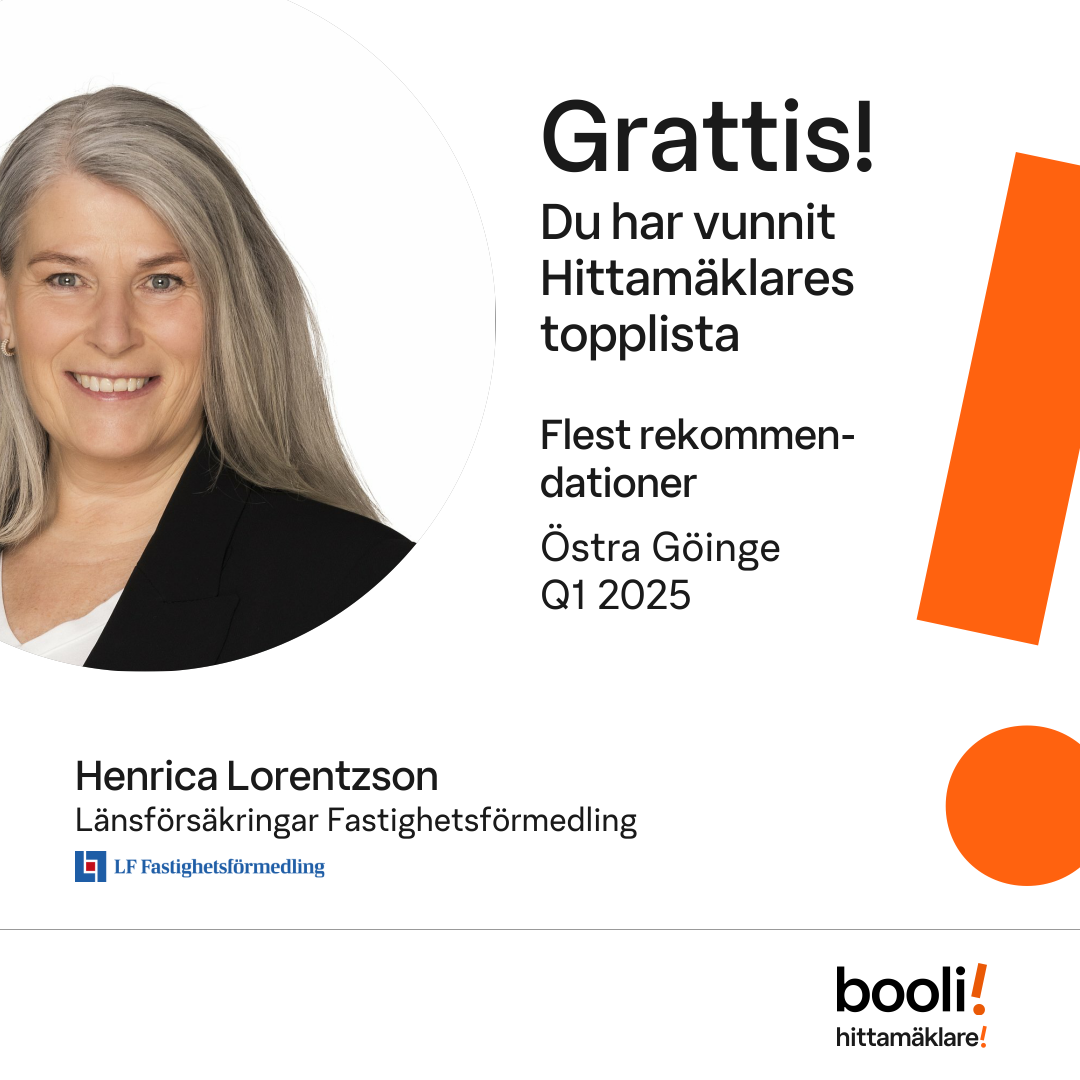 Statistik för publicerade bostäder, försäljningar och omdömen baseras på data från Booli och Hittamäklare. Statistiken för försäljningar avser inrapporterade och verifierade slutpriser från mäklare eller av Booli inhämtade och verifierade slutpriser. Statistiken för publicerade bostäder baseras på information som publicerats på Booli.se. Statistik för omdömen och rekommendationer baseras på omdömen från säljare som lämnats via Booli och Hittamäklare.