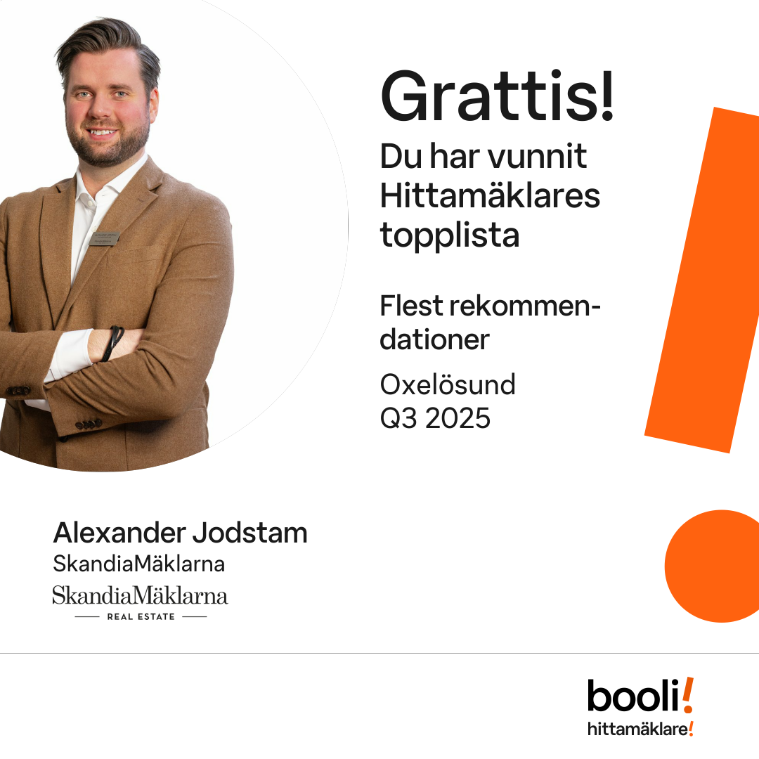 Statistik för publicerade bostäder, försäljningar och omdömen baseras på data från Booli och Hittamäklare. Statistiken för försäljningar avser inrapporterade och verifierade slutpriser från mäklare eller av Booli inhämtade och verifierade slutpriser. Statistiken för publicerade bostäder baseras på information som publicerats på Booli.se. Statistik för omdömen och rekommendationer baseras på omdömen från säljare som lämnats via Booli och Hittamäklare.