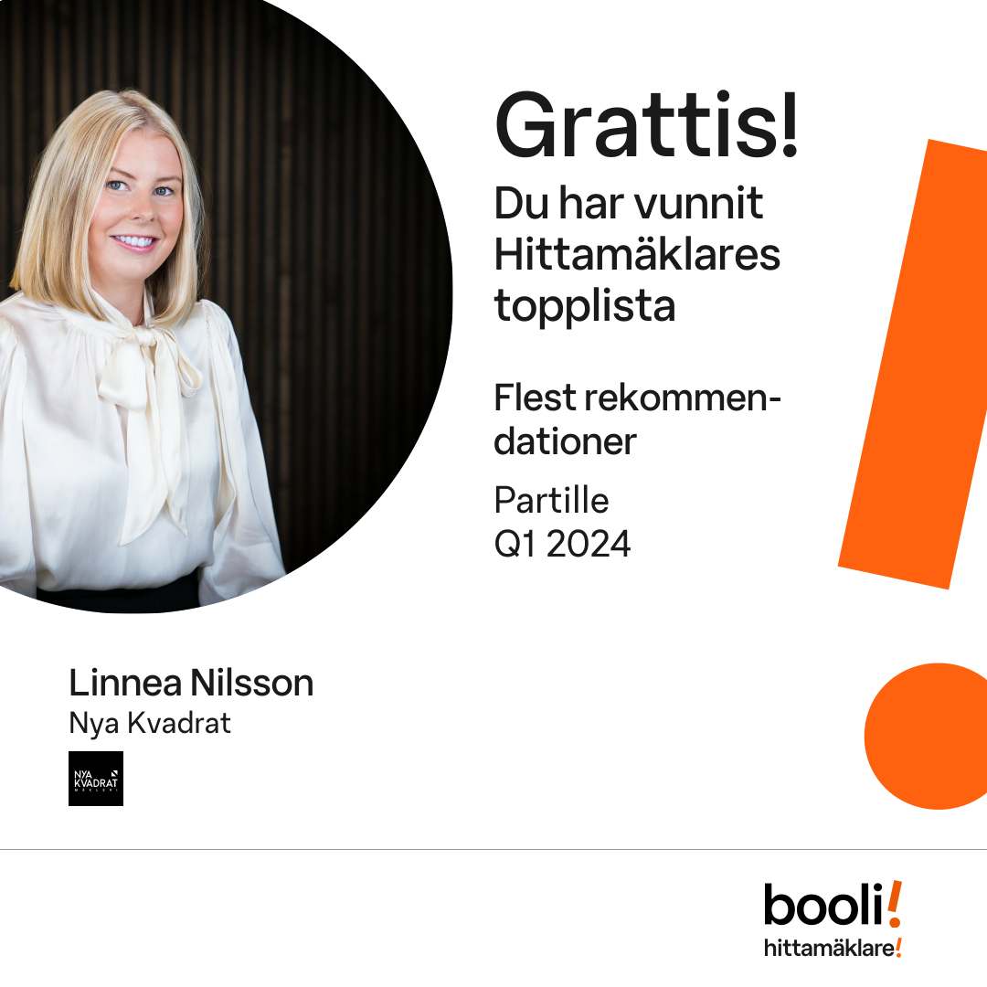 Statistik för publicerade bostäder, försäljningar och omdömen baseras på data från Booli och Hittamäklare. Statistiken för försäljningar avser inrapporterade och verifierade slutpriser från mäklare eller av Booli inhämtade och verifierade slutpriser. Statistiken för publicerade bostäder baseras på information som publicerats på Booli.se. Statistik för omdömen och rekommendationer baseras på omdömen från säljare som lämnats via Booli och Hittamäklare.