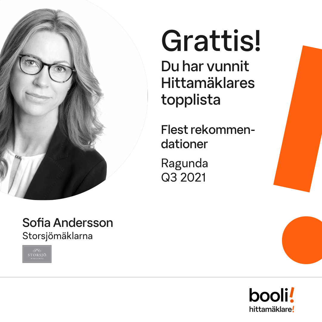 Statistik för publicerade bostäder, försäljningar och omdömen baseras på data från Booli och Hittamäklare. Statistiken för försäljningar avser inrapporterade och verifierade slutpriser från mäklare eller av Booli inhämtade och verifierade slutpriser. Statistiken för publicerade bostäder baseras på information som publicerats på Booli.se. Statistik för omdömen och rekommendationer baseras på omdömen från säljare som lämnats via Booli och Hittamäklare.