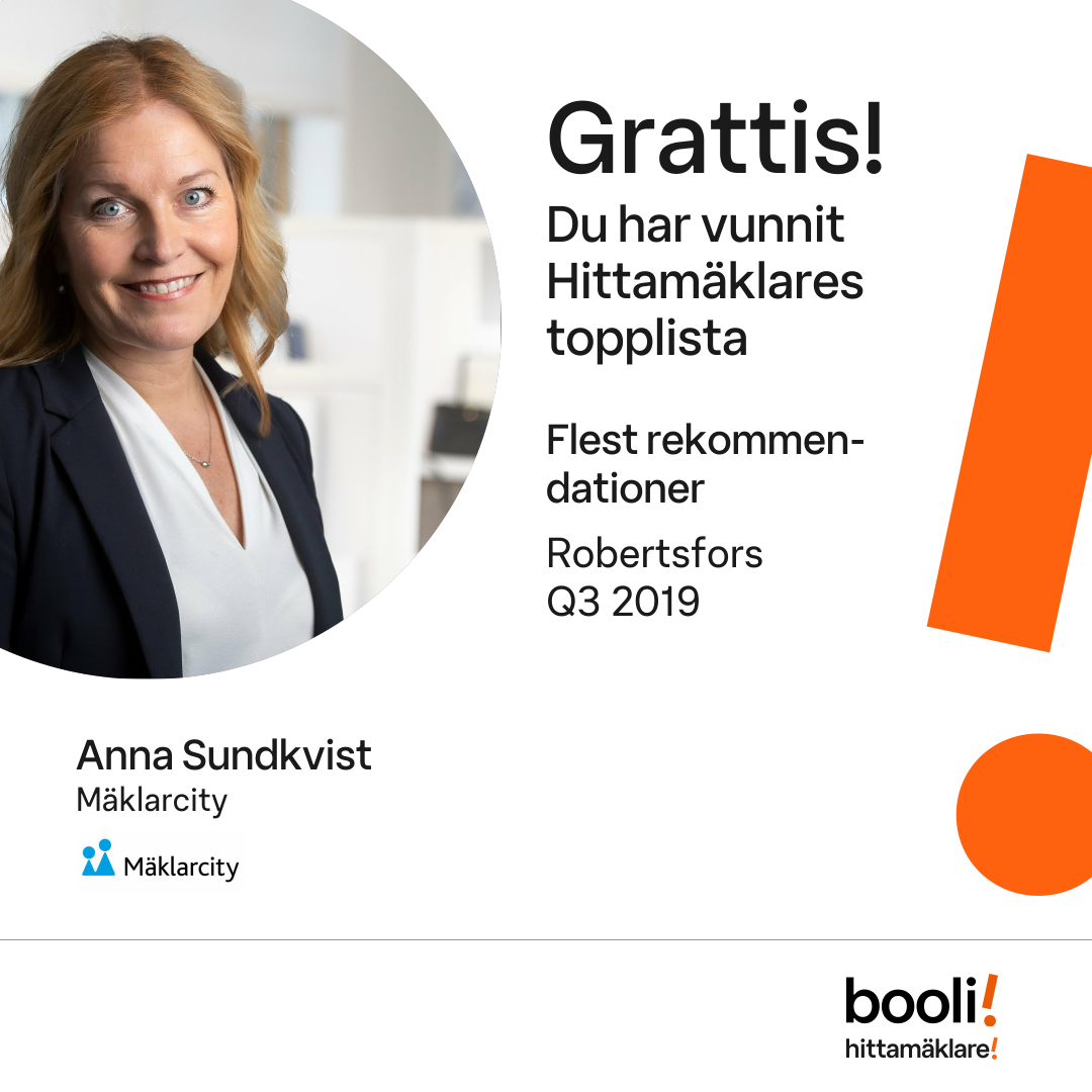 Statistik för publicerade bostäder, försäljningar och omdömen baseras på data från Booli och Hittamäklare. Statistiken för försäljningar avser inrapporterade och verifierade slutpriser från mäklare eller av Booli inhämtade och verifierade slutpriser. Statistiken för publicerade bostäder baseras på information som publicerats på Booli.se. Statistik för omdömen och rekommendationer baseras på omdömen från säljare som lämnats via Booli och Hittamäklare.