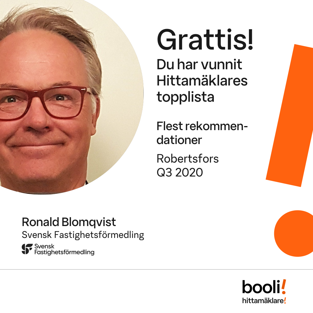 Statistik för publicerade bostäder, försäljningar och omdömen baseras på data från Booli och Hittamäklare. Statistiken för försäljningar avser inrapporterade och verifierade slutpriser från mäklare eller av Booli inhämtade och verifierade slutpriser. Statistiken för publicerade bostäder baseras på information som publicerats på Booli.se. Statistik för omdömen och rekommendationer baseras på omdömen från säljare som lämnats via Booli och Hittamäklare.
